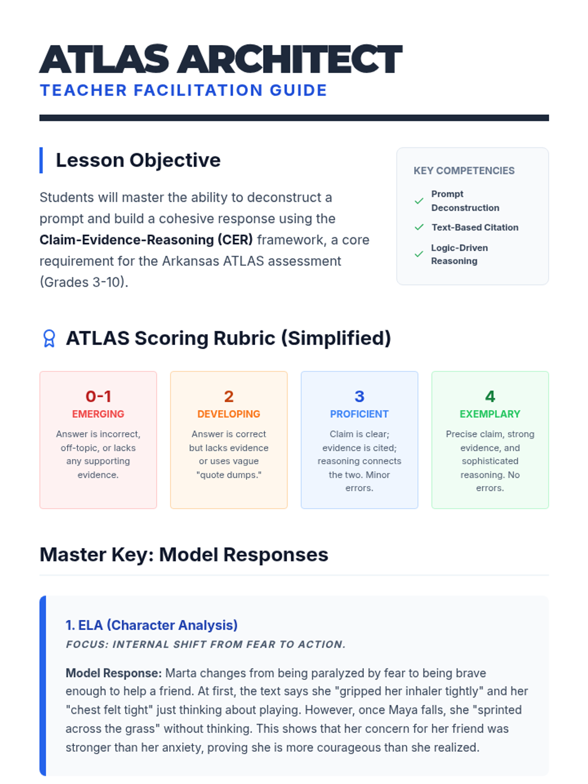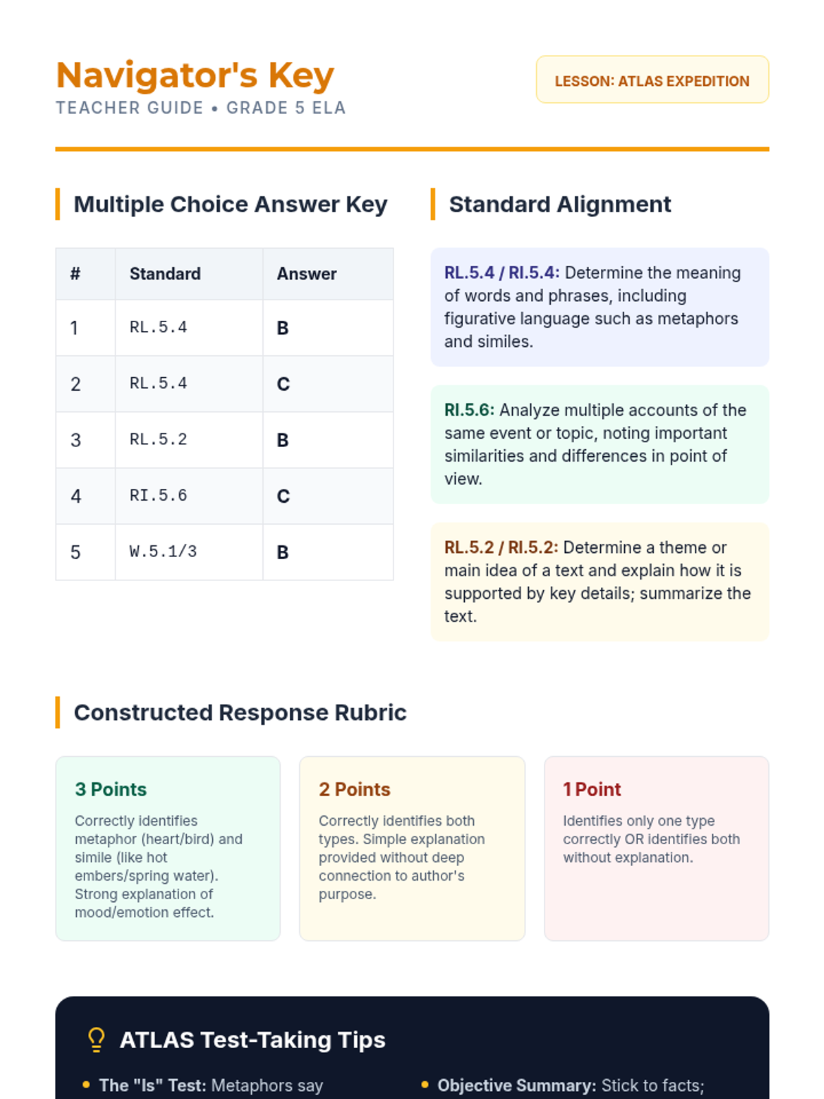 A detailed teacher guide featuring scoring rubrics, model responses for all practice prompts, and troubleshooting tips for common student mistakes. Revised for better page breaks and formatting.