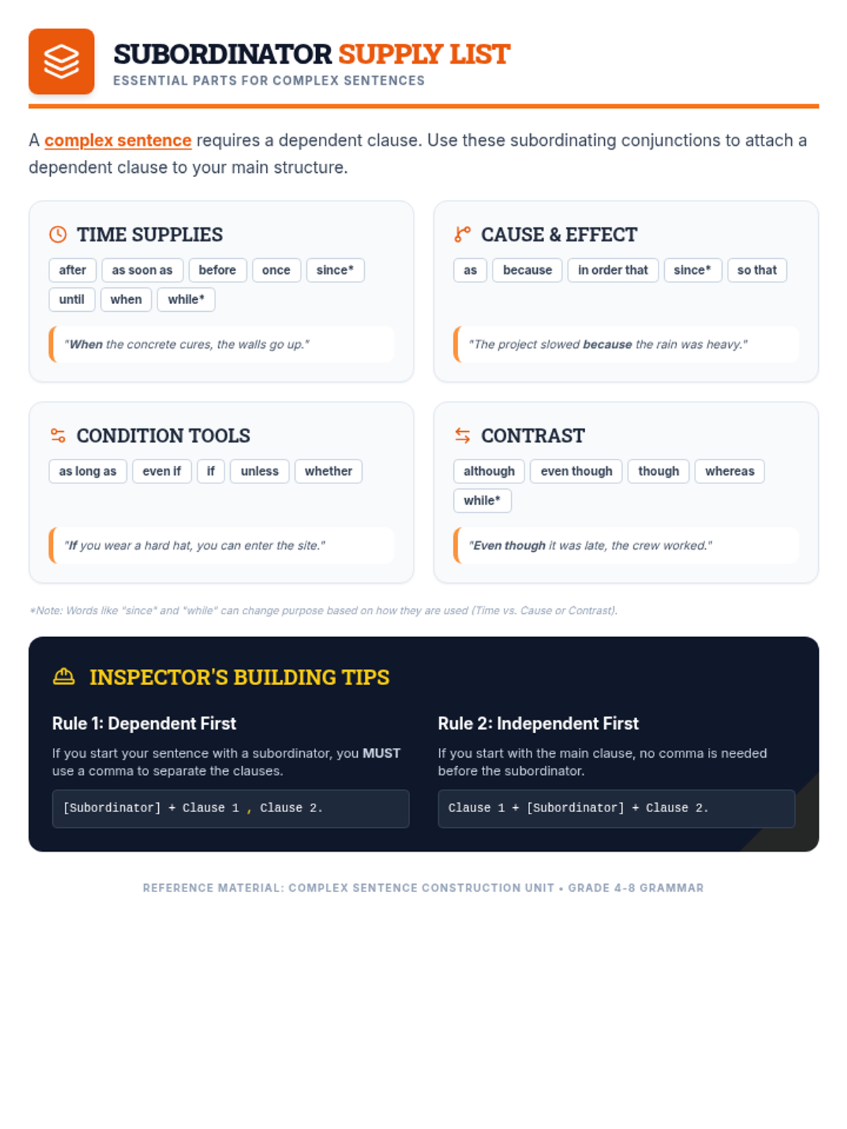 A construction-themed reference sheet for students listing common subordinating conjunctions categorized by function. It includes visual examples and rules for comma usage in complex sentences.