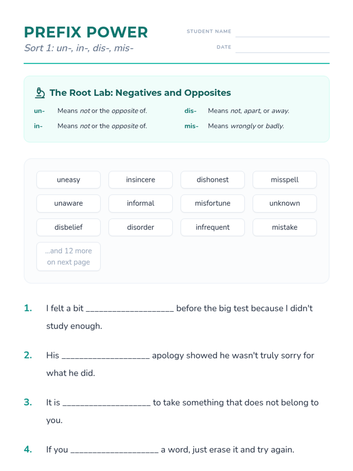 Fill-in-the-blank worksheets for spelling sorts 1 and 2, focusing on common prefixes like un-, in-, dis-, mis-, pre-, fore-, post-, and after-. Includes root definitions, word banks, and ample writing space.