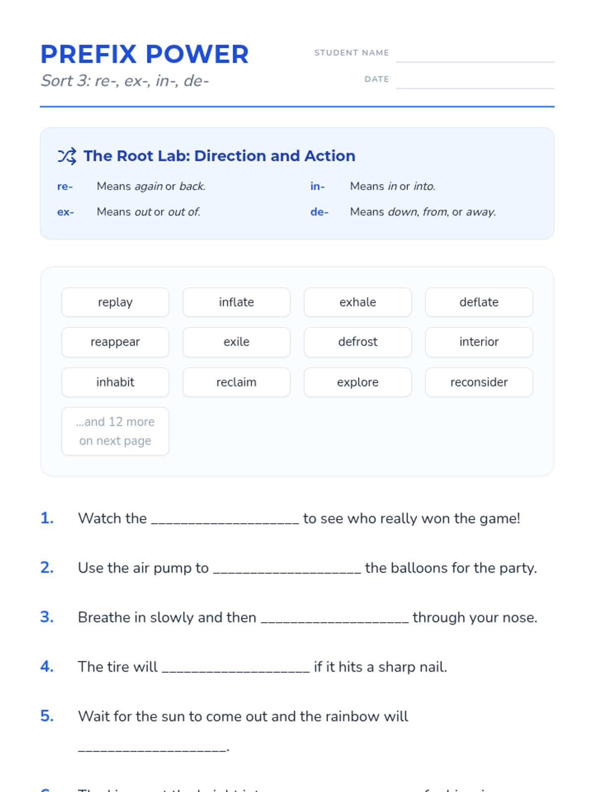 Worksheets for Sorts 3 and 4, focusing on action and direction prefixes (re-, ex-, in-, de-) and position/connection prefixes (sub-, com-, pro-, en-). Includes sentence exercises and root explanations.