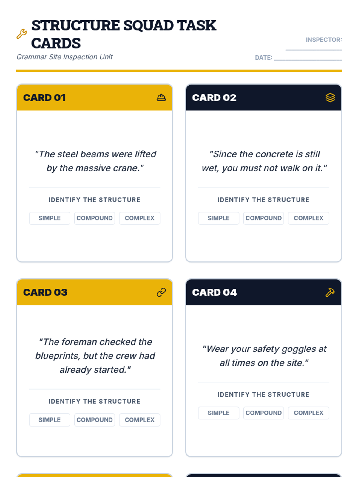 A set of construction-themed task cards for practicing sentence identification and construction. Students identify simple, compound, and complex sentences and practice combining clauses.