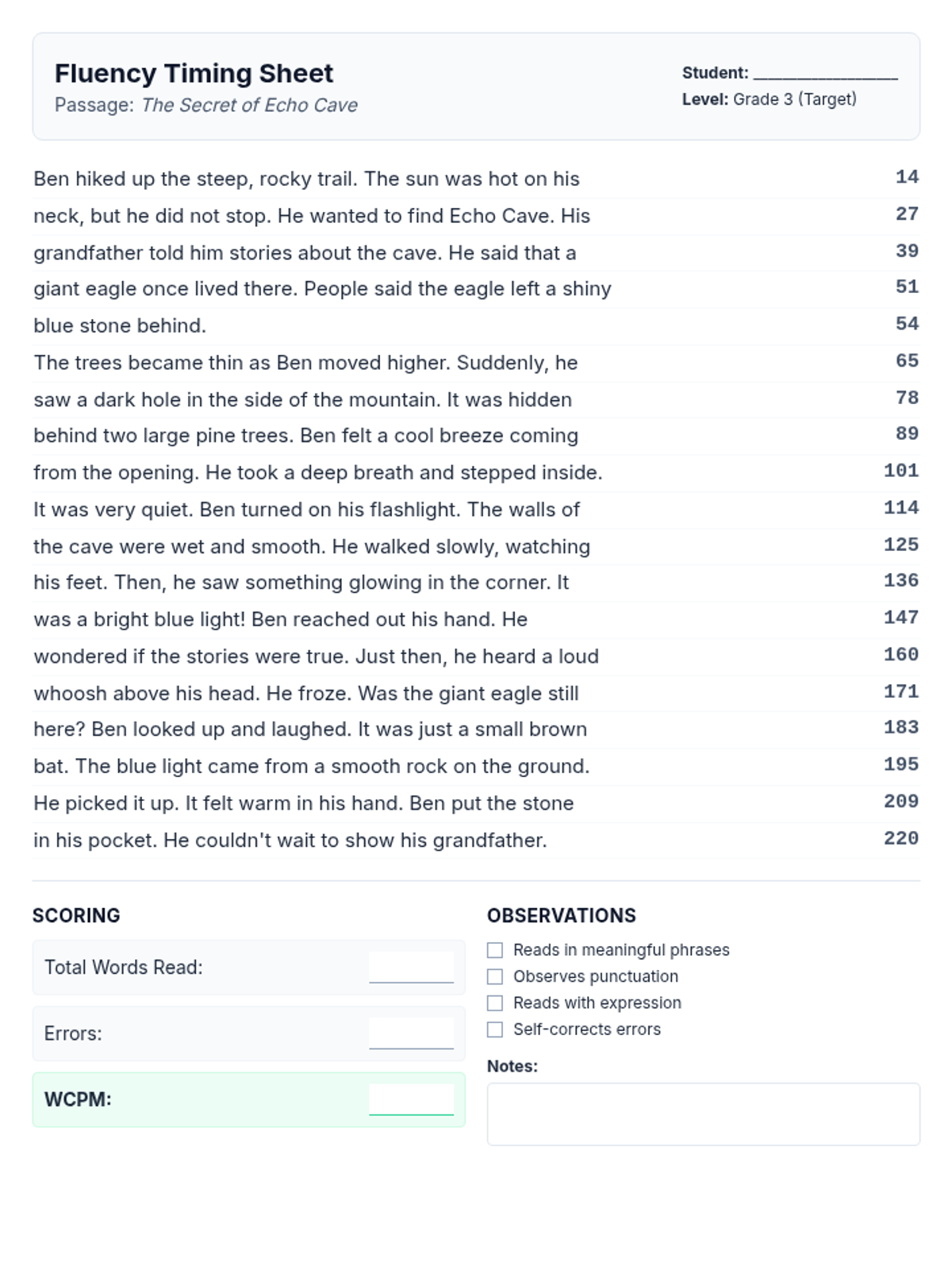 A teacher-facing fluency timing sheet for the 'Secret of Echo Cave' passage, featuring cumulative word counts and a scoring section for Words Correct Per Minute (WCPM).