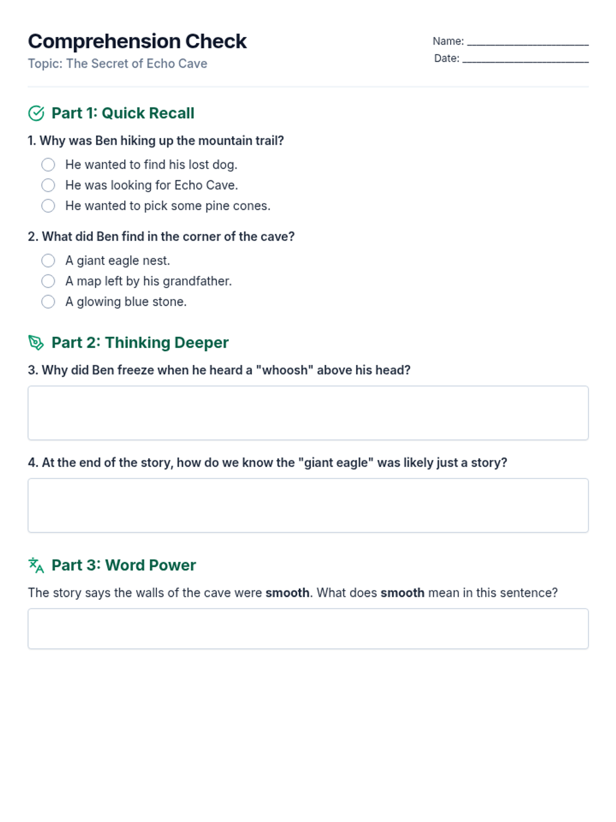 A comprehension worksheet for the 'Secret of Echo Cave' passage, including multiple-choice recall questions and short-answer inference questions.