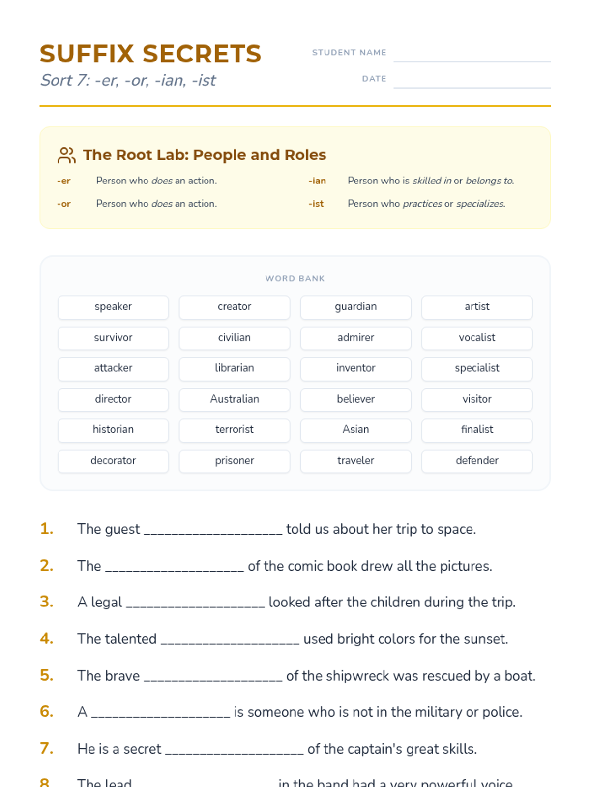 Worksheets for Sorts 7 and 8, focusing on person suffixes (-er, -or, -ian, -ist) and state/condition suffixes (-ment, -less, -ness). Includes clear root definitions and fill-in-the-blank exercises.