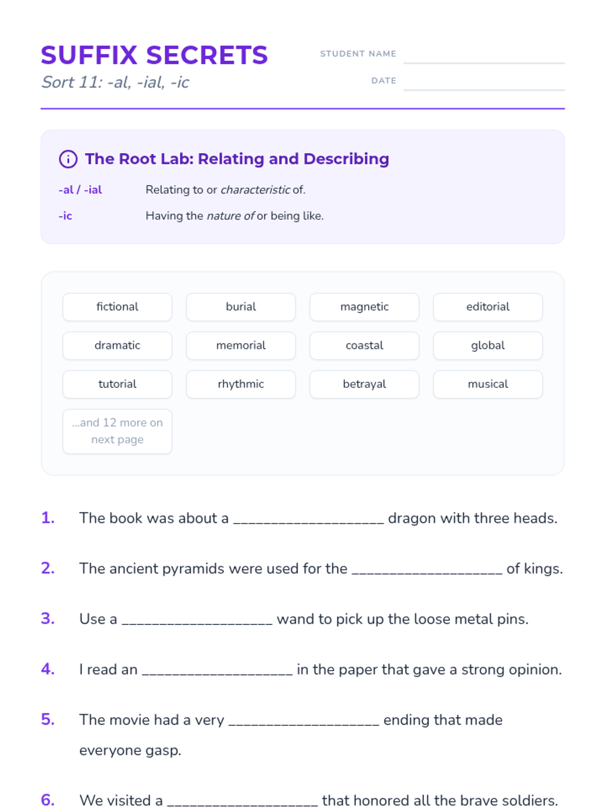 Worksheets for Sorts 11 and 12, focusing on adjective suffixes (-al, -ial, -ic) and quality suffixes (-ful, -ous, -ious). Includes root definitions and sentence exercises.