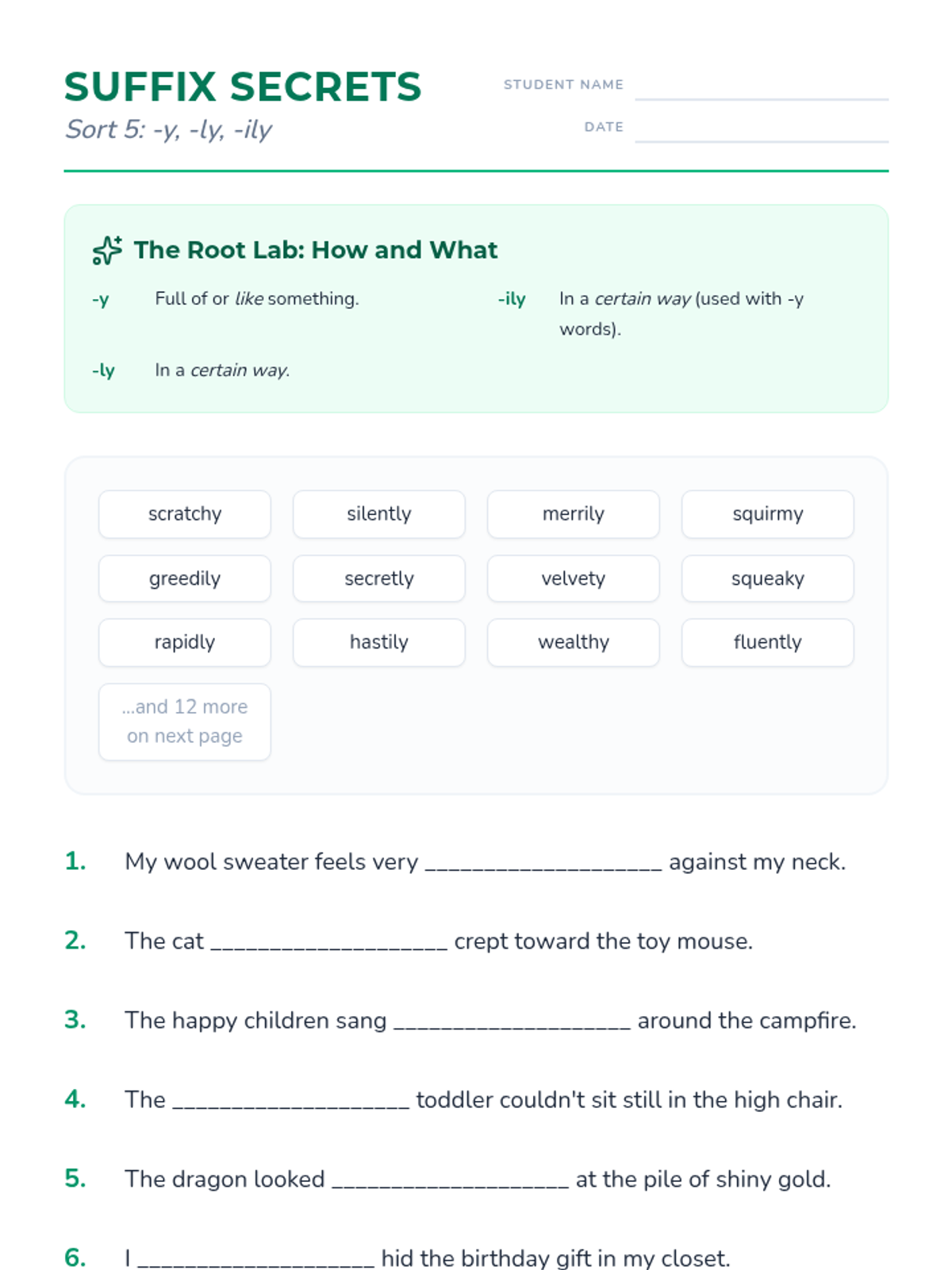 Worksheets for Sorts 5 and 6, focusing on descriptive suffixes (-y, -ly, -ily) and comparative suffixes (-er, -est, -ier, -iest). Includes root definitions and sentence exercises for each word.
