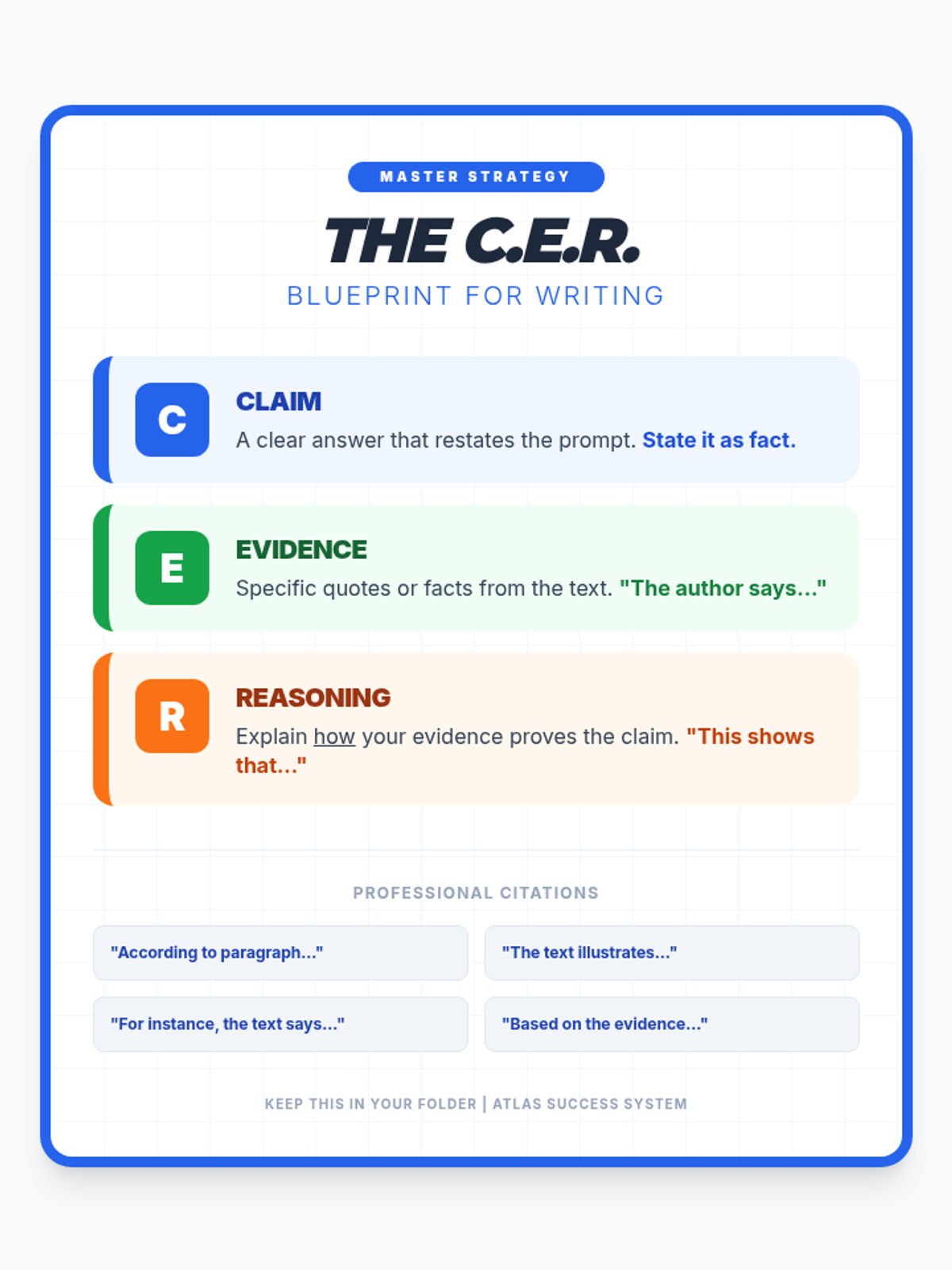 A high-impact anchor chart / reference card designed for student folders, providing a quick visual guide to the CER framework and citation starters. Revised with high-contrast, ink-friendly colors.