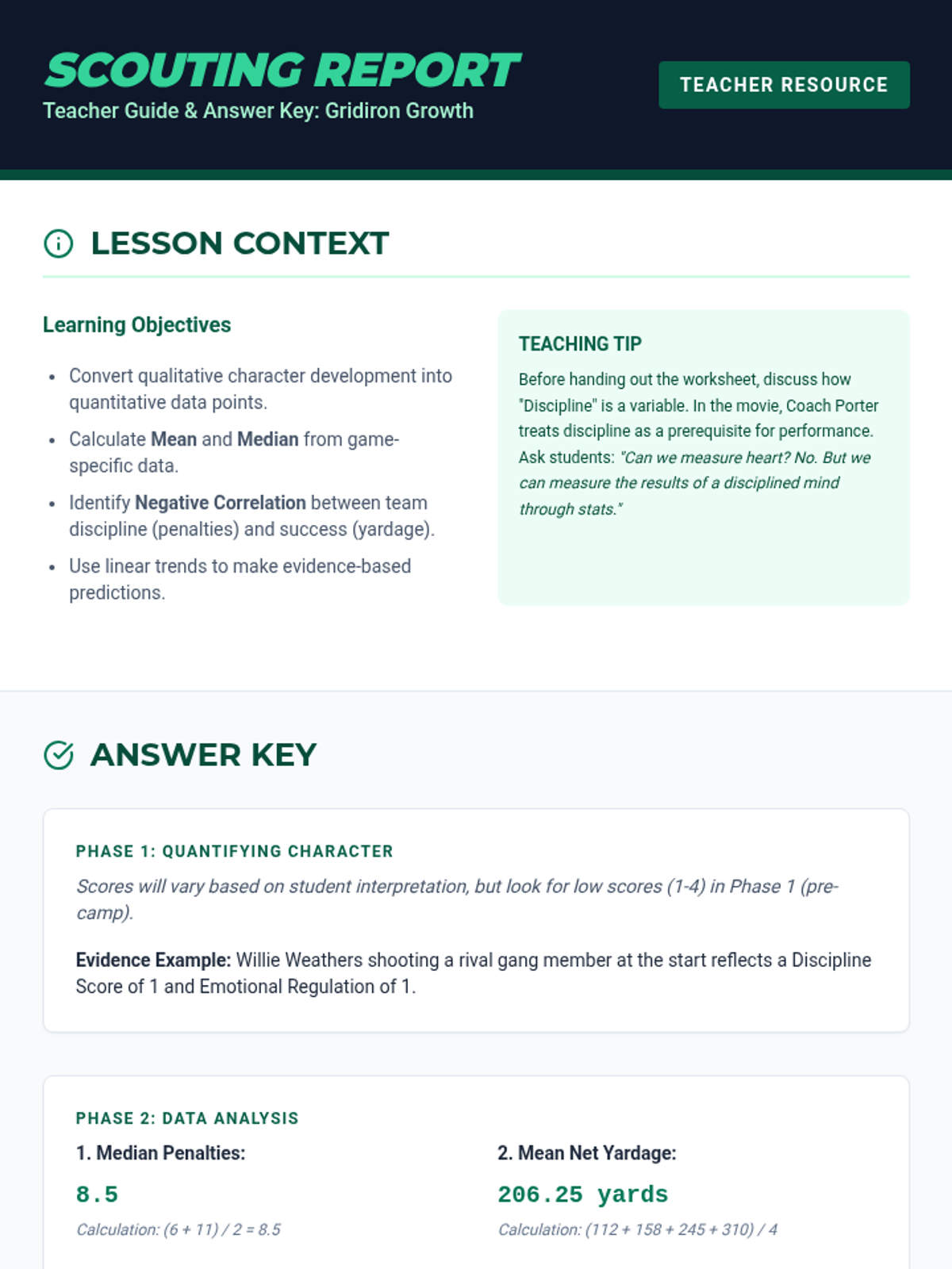 A teacher-facing answer key and instructional guide for the Gridiron Growth worksheet. Includes statistical calculations, sample character analysis, and high-level discussion prompts for the film.