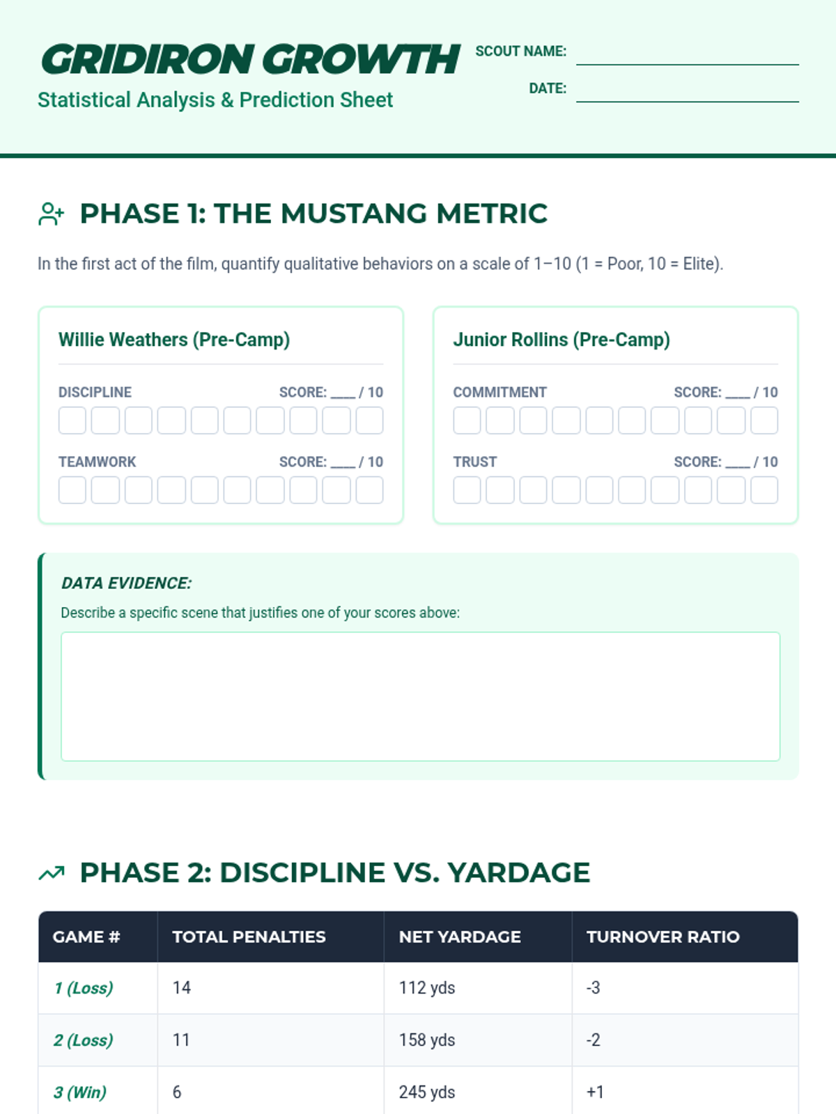 A character growth and statistical analysis worksheet based on the film Gridiron Gang. Students quantify character traits, analyze game data trends, and use statistical reasoning to predict the team's championship outcome.