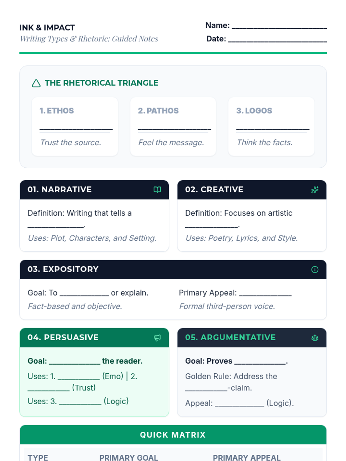 A tightly optimized, single-page guided notes assignment for 9th graders. Includes Rhetorical Triangle section, Writing Type breakdowns, and a Comparison Matrix with improved handwriting areas.