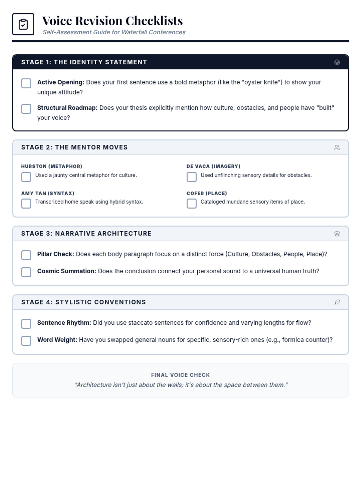 Detailed revision checklists aligned with the four stages of the waterfall conference log (Thesis, Mentor Skills, Organization, and Conventions). Provides students with actionable checkpoints to self-assess the architectural development of their personal voice.