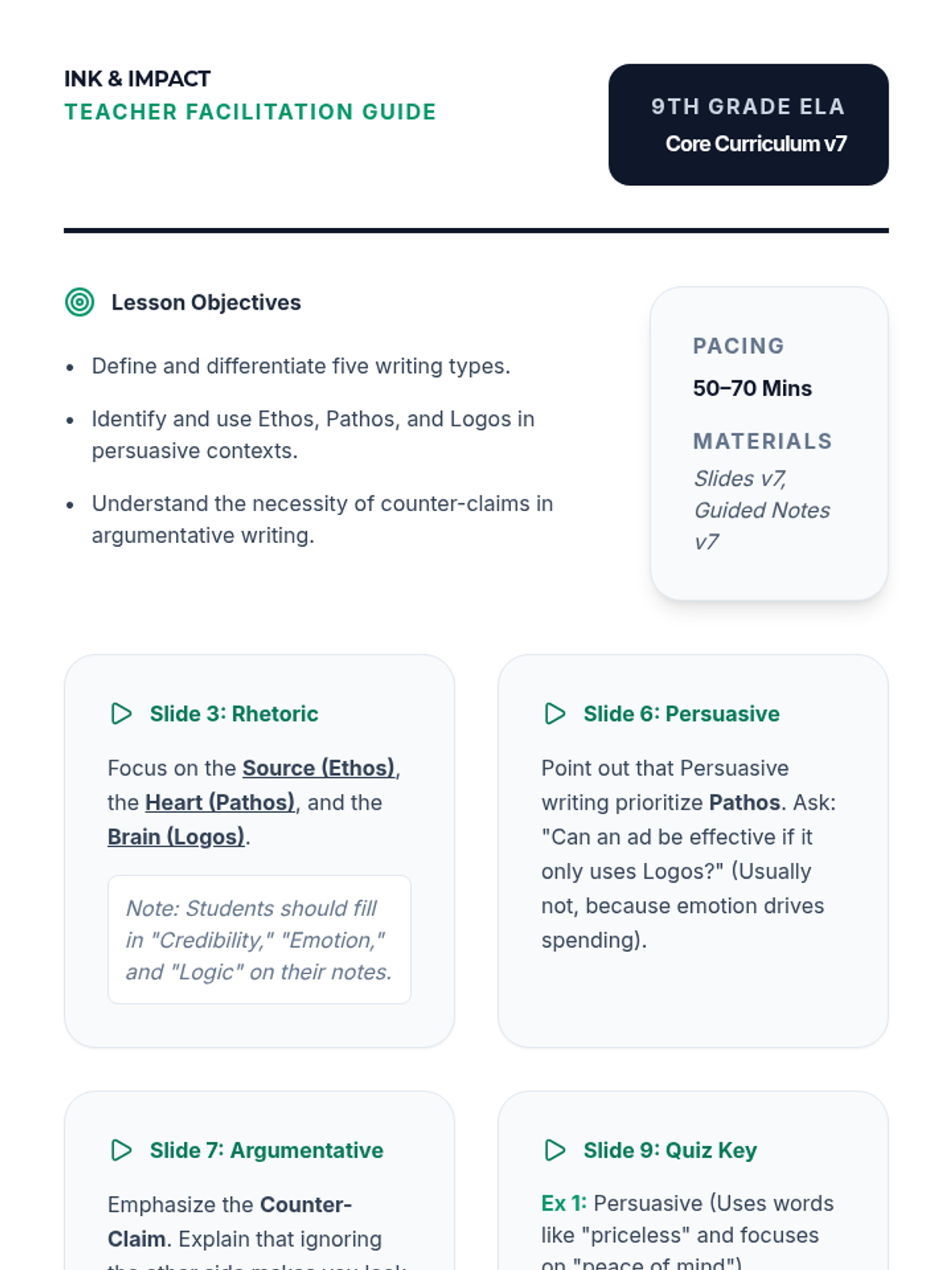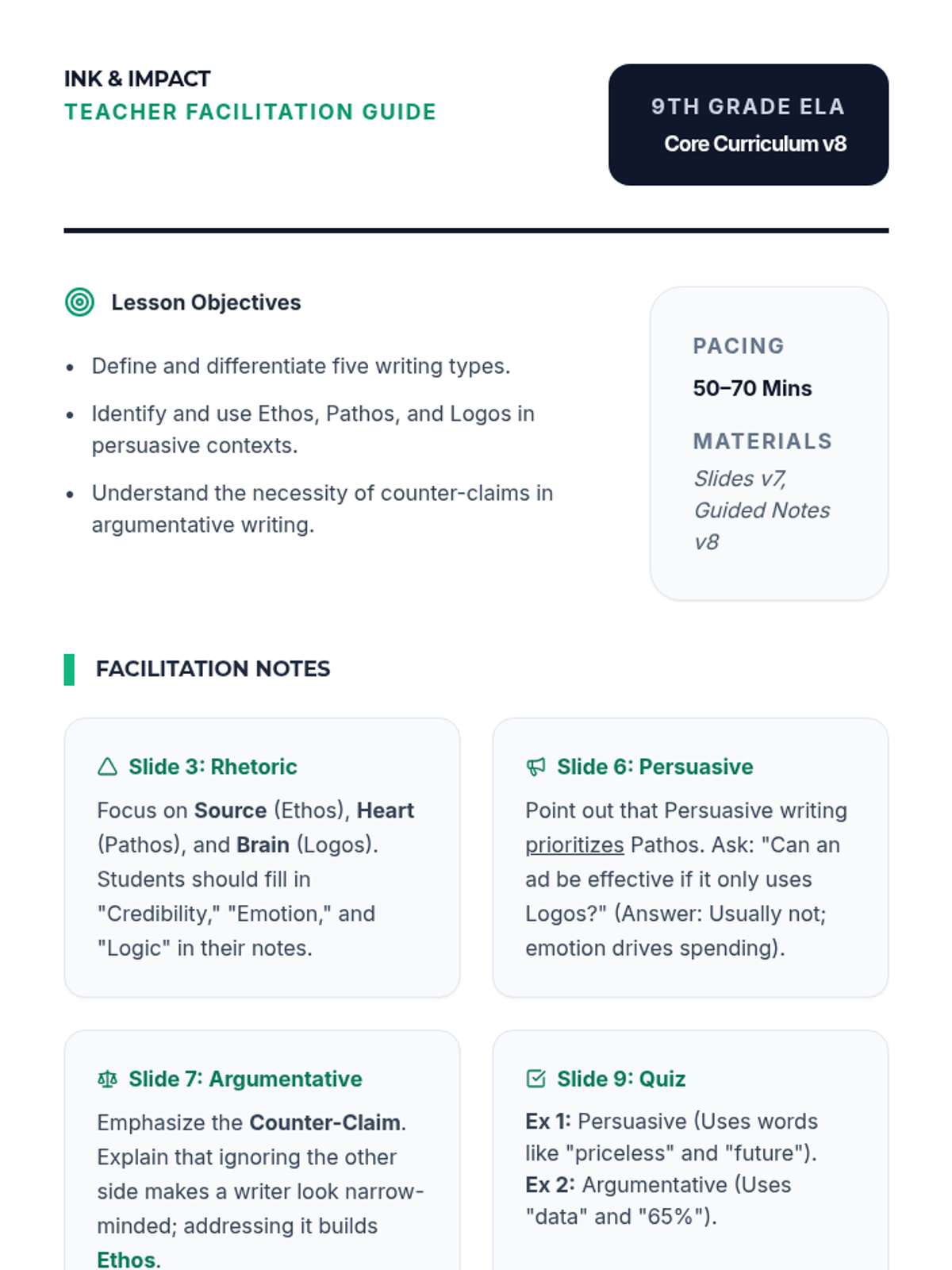 An updated teacher guide for 9th grade including notes on the Rhetorical Triangle and revised activity examples. Refined layout for better contrast and clarity. Match with v7 slides and notes.