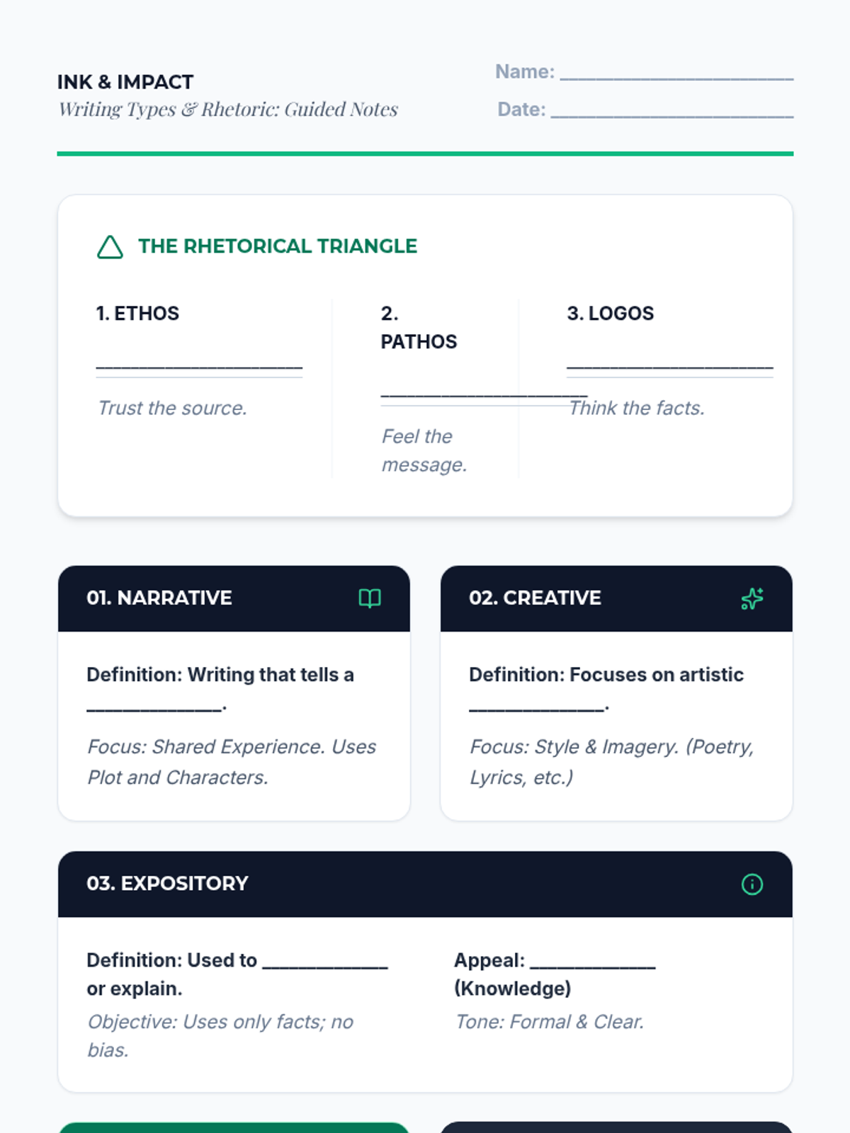 A high-quality, single-page guided notes assignment for 9th graders. Optimized for print with clear contrast, generous handwriting areas, and a cohesive instructional flow. Includes a dedicated rhetorical triangle section.