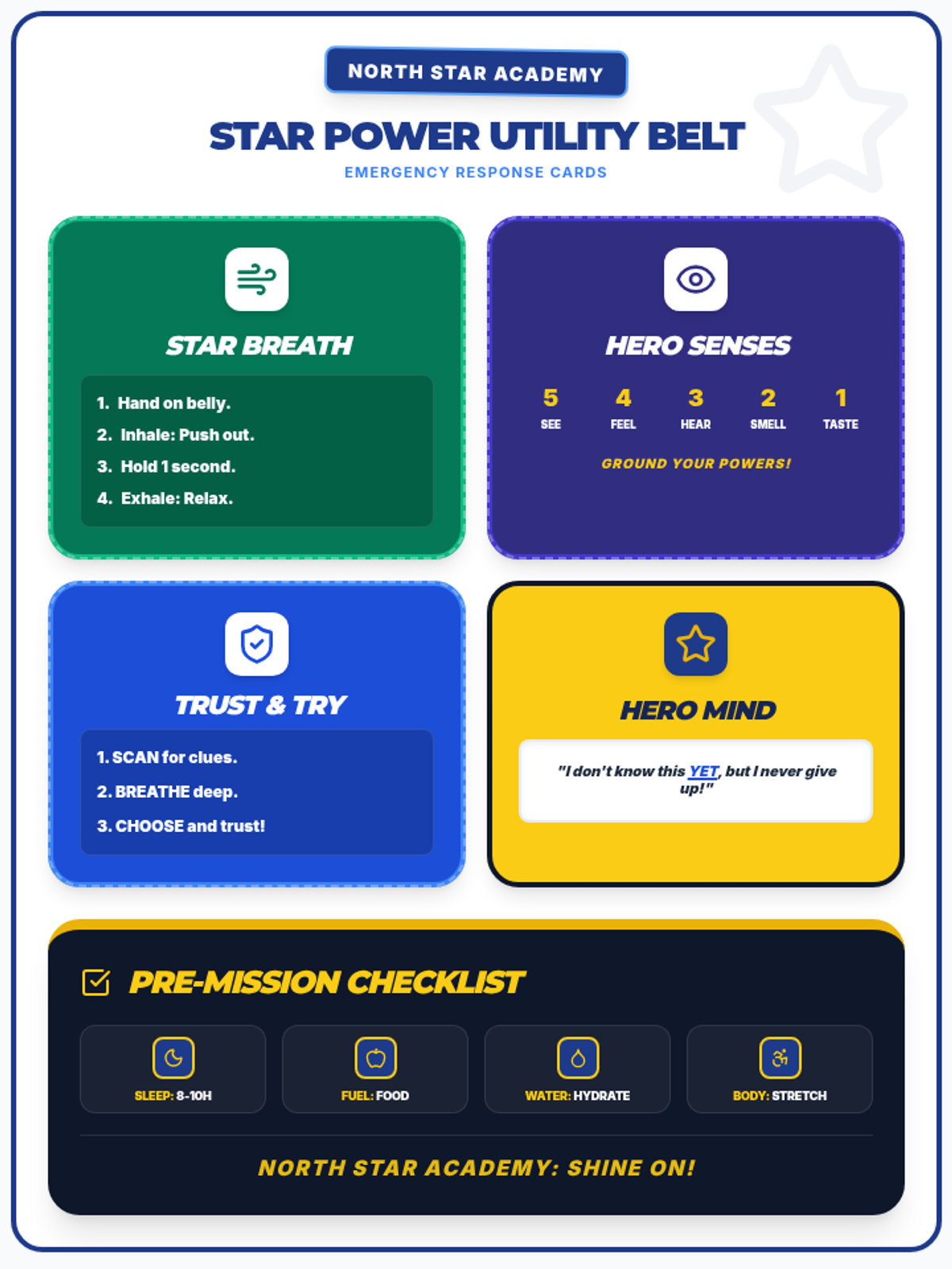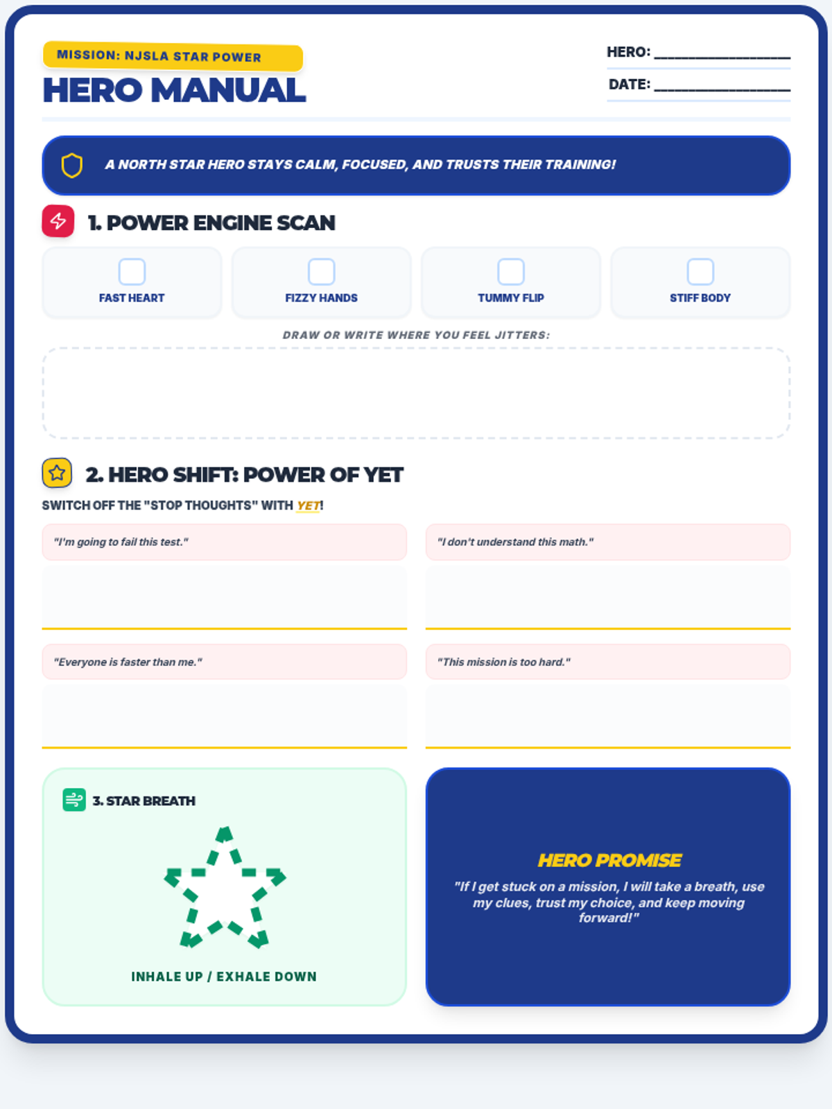 A superhero-themed worksheet for North Star Academy students. Features 'Hero Engine' jitter detection, 'Power of Yet' growth mindset challenges, and a Star Breath tracing activity. Updated for adaptive testing missions.