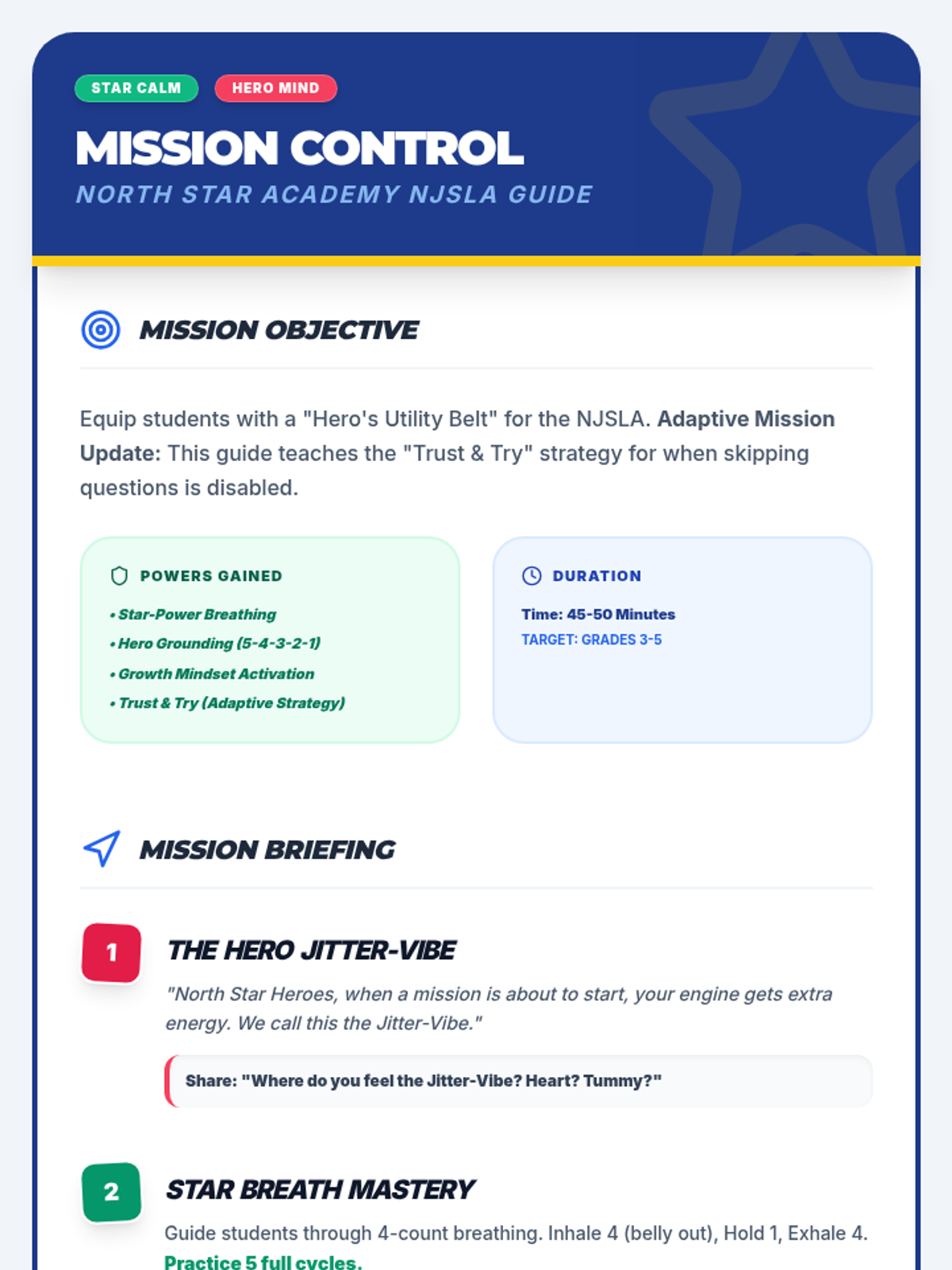 A superhero-themed teacher guide specifically for North Star Academy. Frames test prep as mission control training. Updated for adaptive testing, focusing on 'Trust & Try' instead of skipping.
