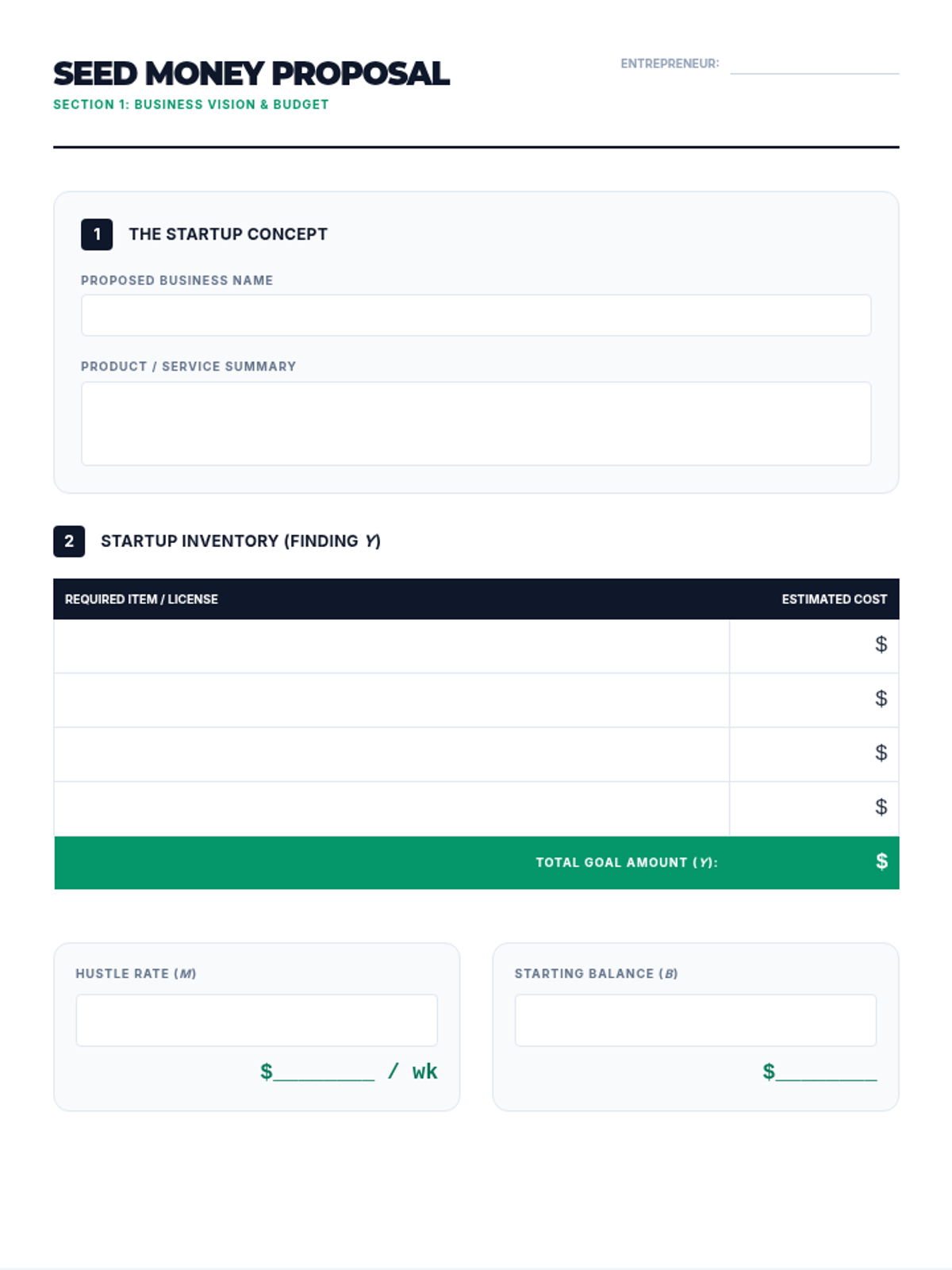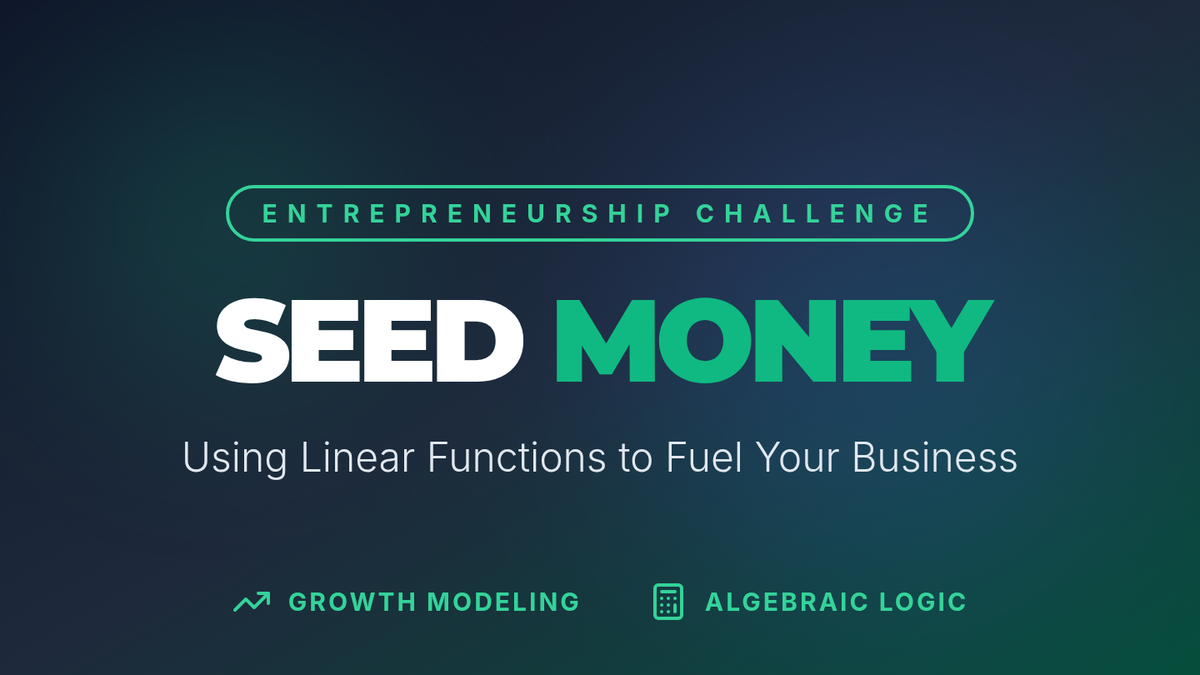 A visual presentation to introduce the Seed Money project, breaking down the linear equation into real-world business components (savings rate, initial funds, and total goals).