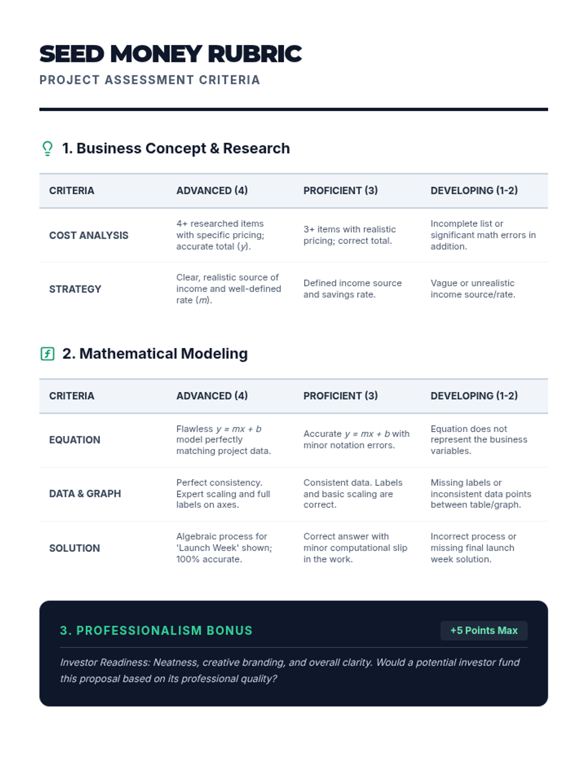 A grading rubric for the Seed Money project, assessing business vision, mathematical modeling accuracy, and professional presentation.