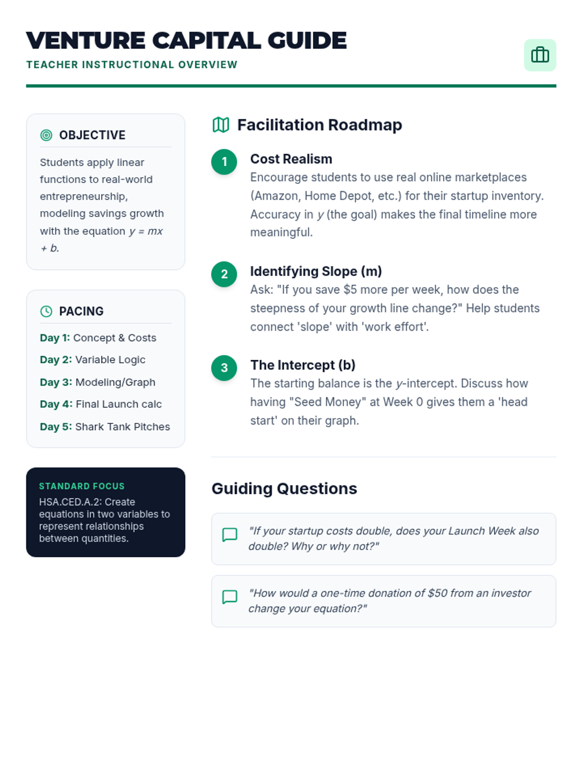 A teacher-facing instructional guide for the Seed Money Startup project, including pacing, objectives, and common student misconceptions regarding linear modeling.