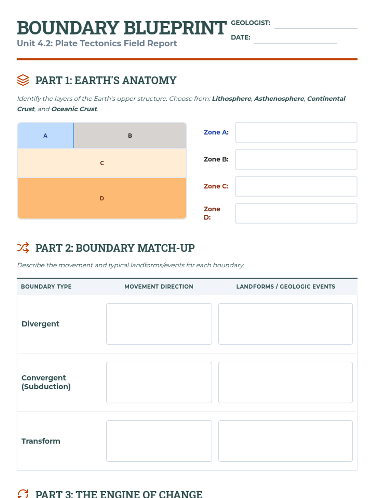 A student worksheet focusing on the anatomical structure of Earth's layers and the mechanisms of plate movement. Includes diagram labeling, boundary classification, and short-response questions.