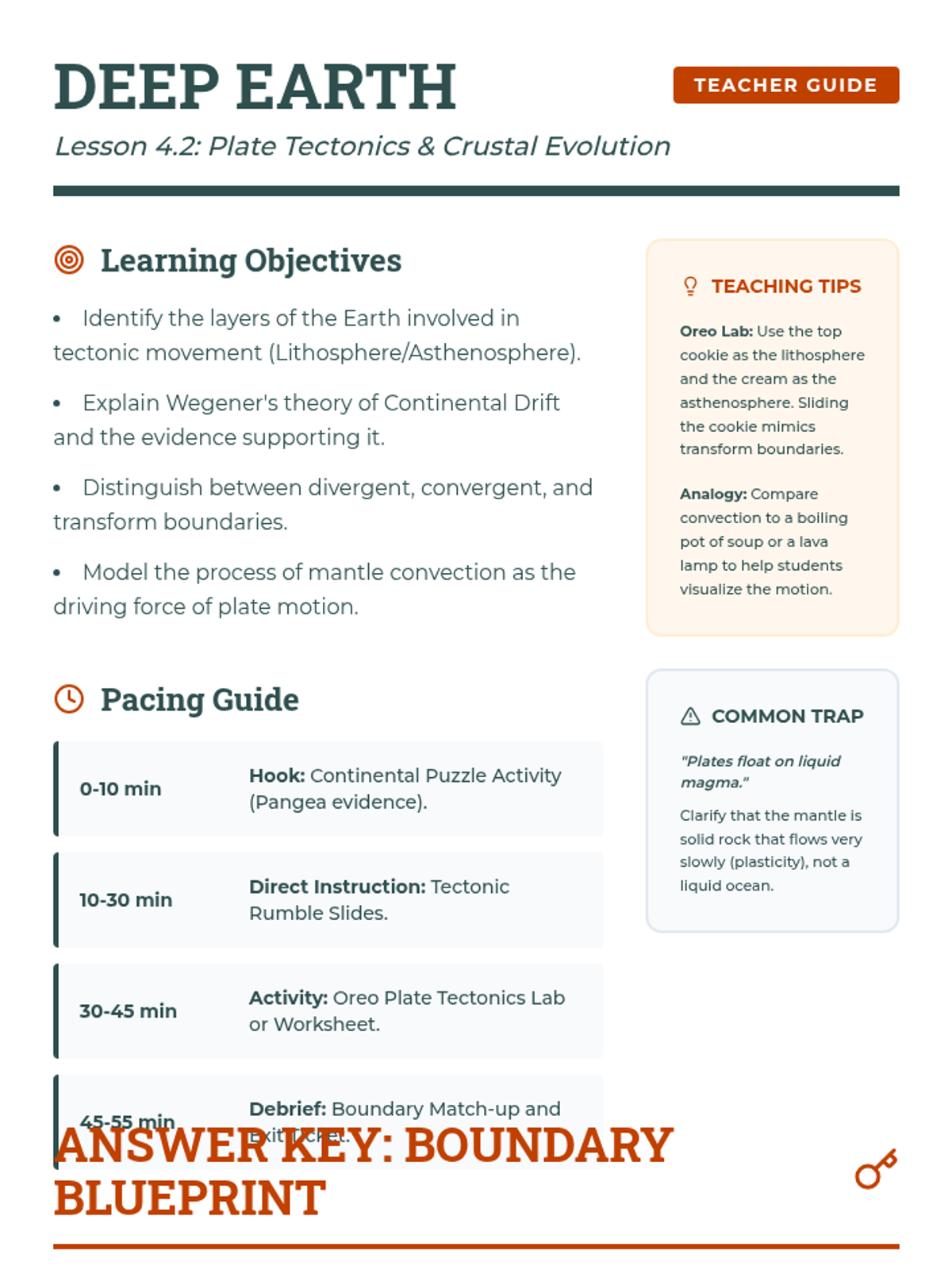 A teacher guide for the Plate Tectonics lesson, featuring learning objectives, a pacing guide, hands-on activity suggestions (Oreo Lab), common misconceptions, and a full answer key for the Boundary Blueprint worksheet.