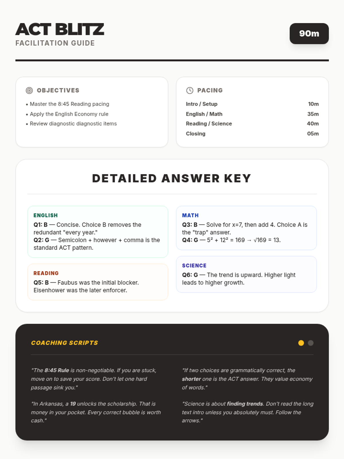 A comprehensive teacher's guide for facilitating the ACT Blitz lesson, including pacing, detailed answer explanations, and motivational coaching prompts.