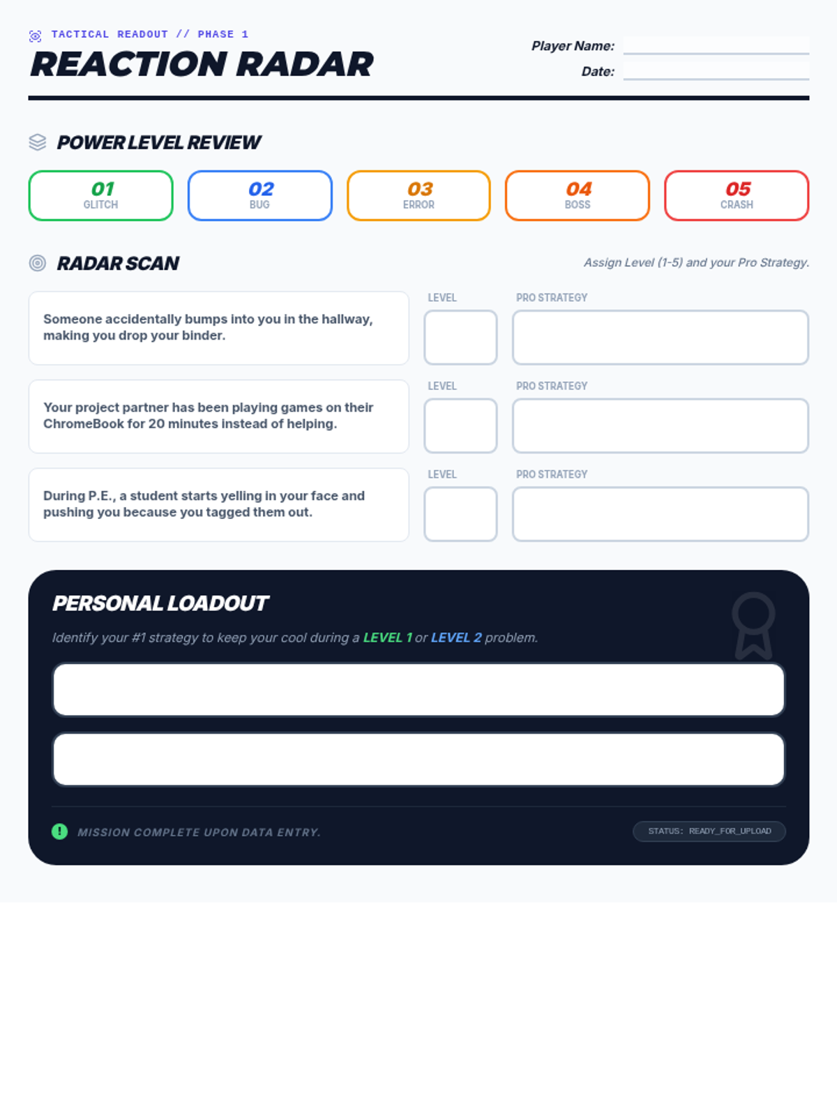 A tactical-themed worksheet for grade 5 students to practice categorizing problems and identifying appropriate reaction strategies. Features a HUD-style layout and scenarios relevant to upper elementary boys.
