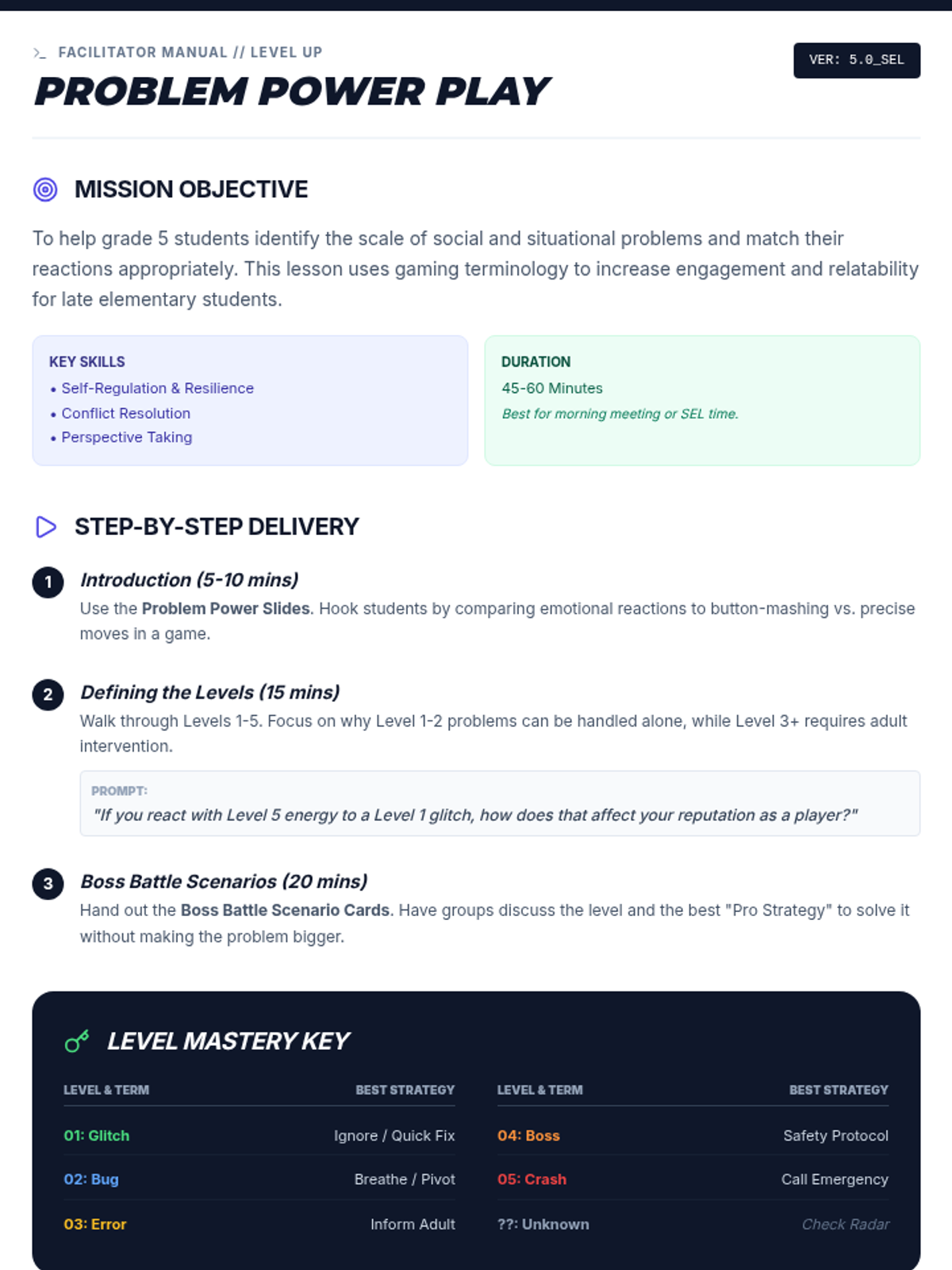 A teacher's facilitation guide for the 'Problem Power Play' lesson. Includes lesson delivery steps, discussion prompts, a mastery key for defining problem levels, and strategies for differentiating the lesson for diverse learners.