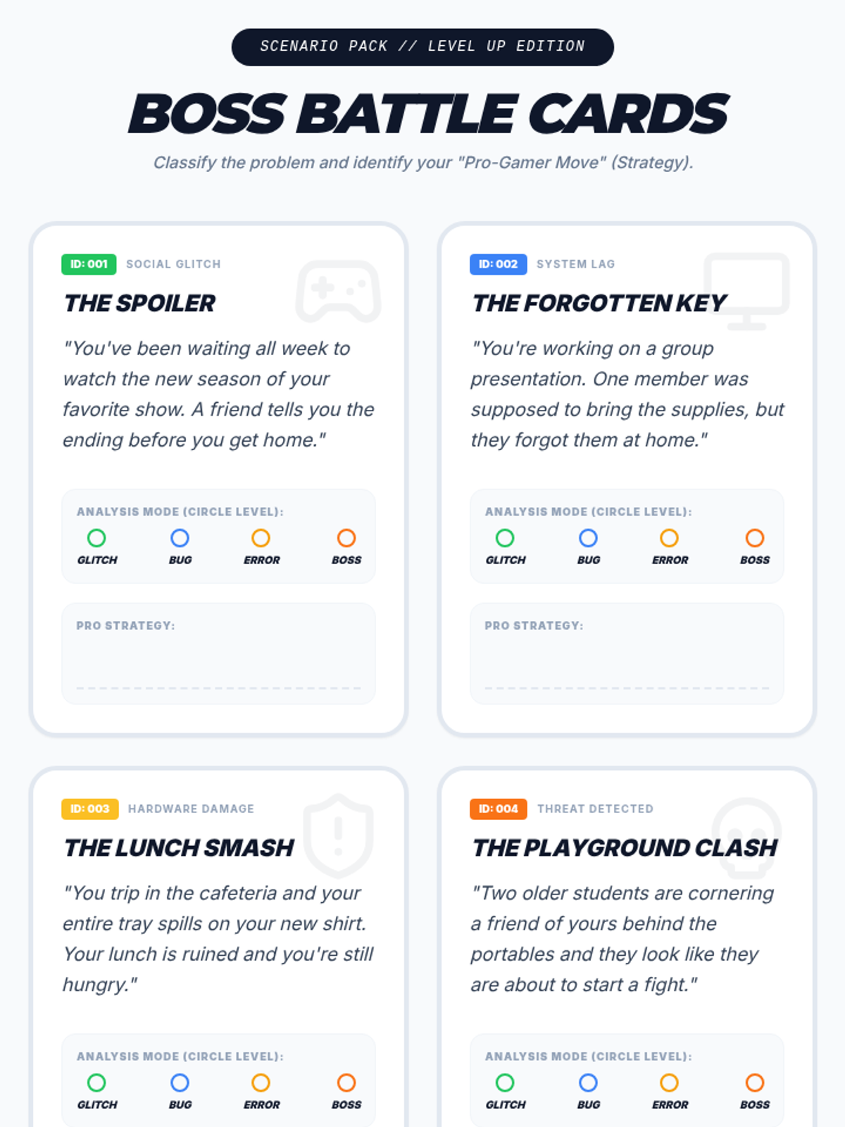 A set of 8 high-engagement scenario cards for grade 5 students focusing on social and situational problems. Each card uses gaming terminology and a 'Boss Battle' aesthetic to help students categorize problem sizes and identify resilience strategies.