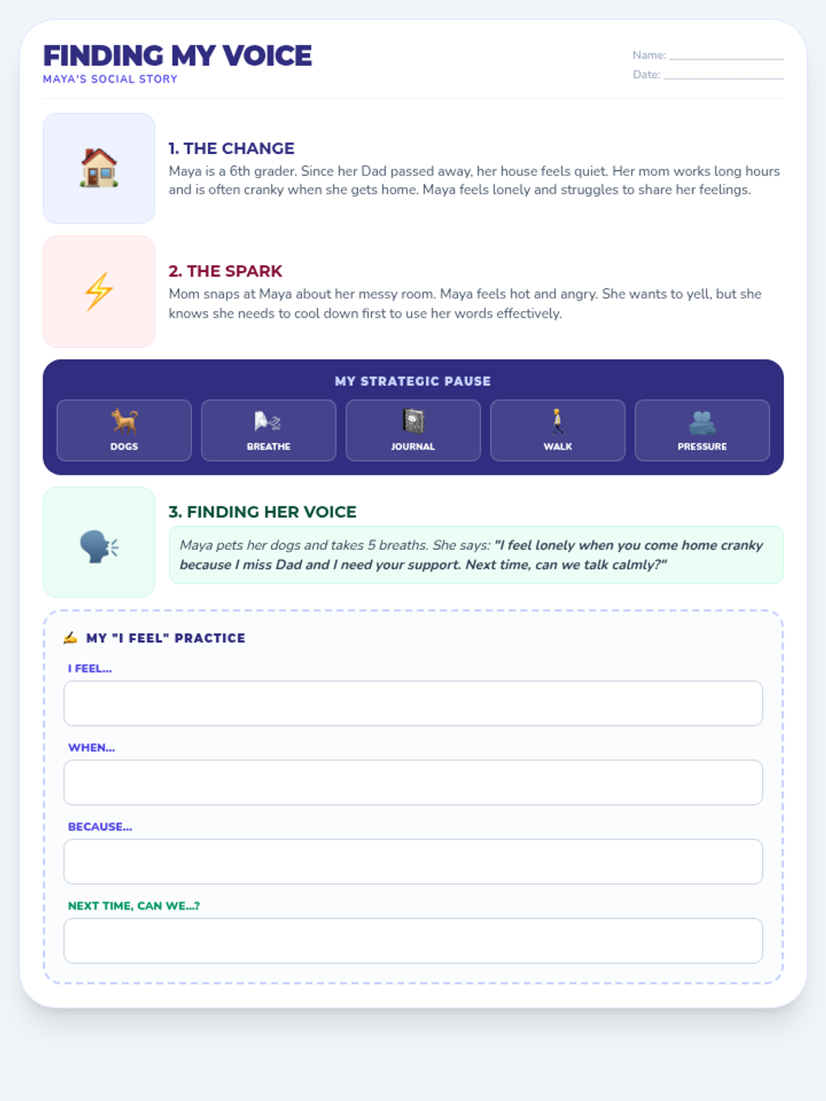 A compact one-page social story featuring Maya, a 6th grader, navigating family tension after loss. Includes narrative sections, a visual coping tool menu, and a structured student practice area for 'I feel' statements.