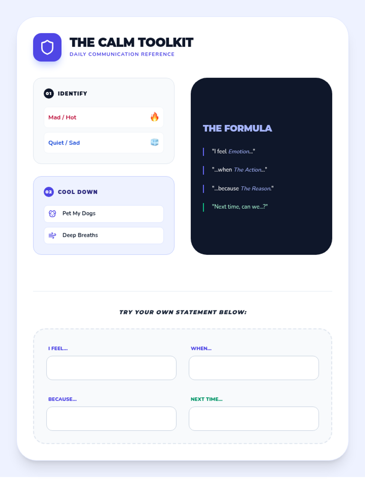 A structured visual reference guide and practice sheet that helps students monitor their emotional state and utilize the 'I feel' statement formula. Designed to fit perfectly on a single page.