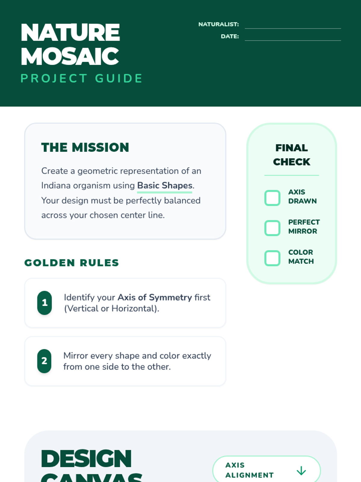 A project guide for students to create geometric nature mosaics. It includes a design canvas with a center line, a checklist for success, and clear instructions for maintaining mathematical balance in their artwork.