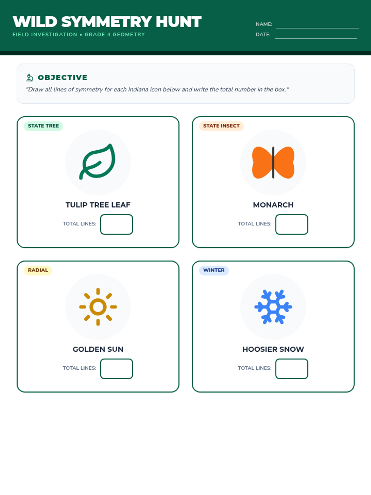 A hands-on student worksheet where fourth graders identify and draw lines of symmetry on Indiana-specific flora and fauna icons, including a drawing challenge to complete a symmetrical feather.