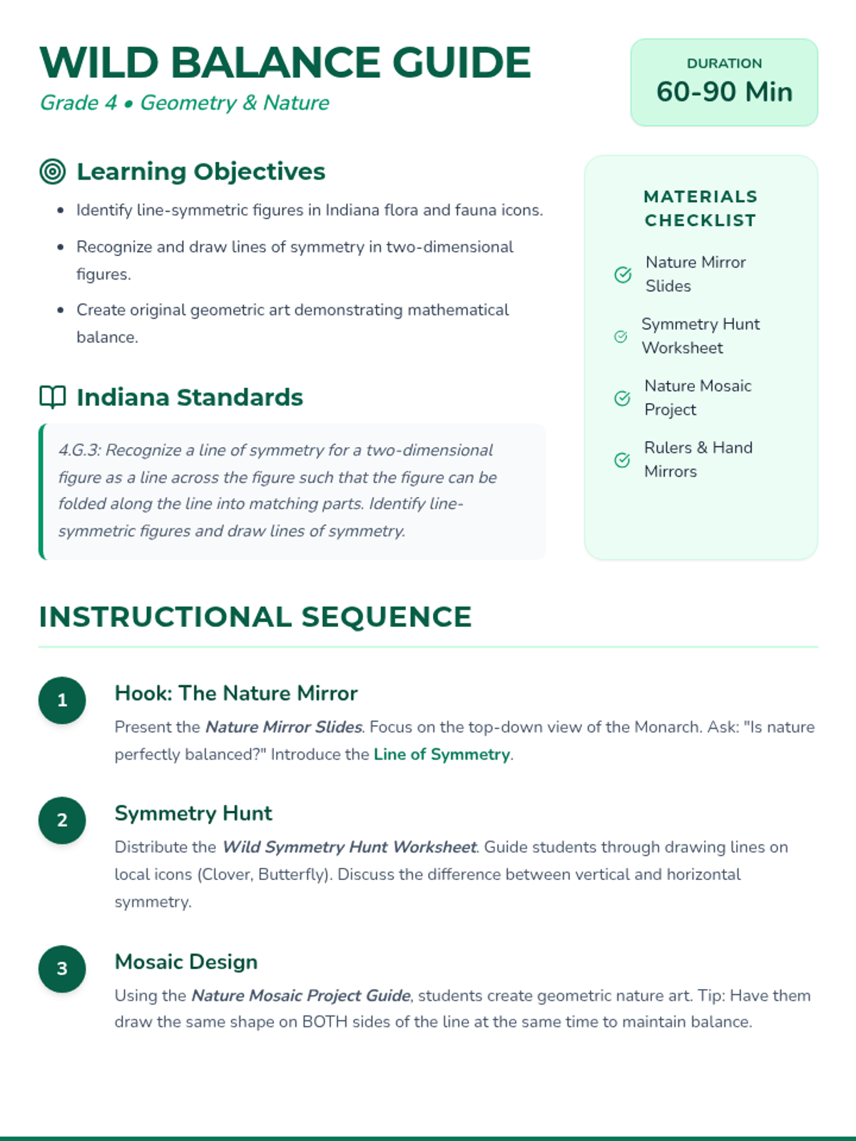A comprehensive teacher guide for the Wild Balance lesson, including instructional steps, Indiana state standards, vocabulary, and differentiation strategies for teaching symmetry through local nature.