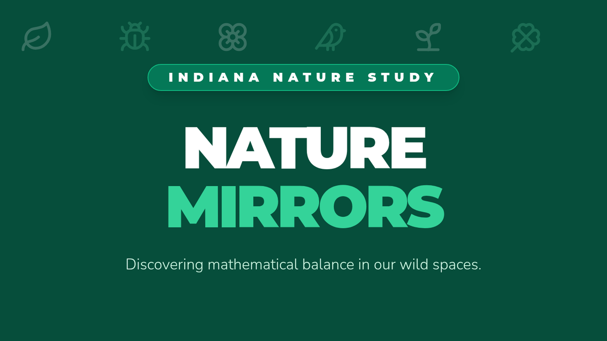 A visually engaging slide deck introducing line symmetry using Indiana icons like the Northern Cardinal and Peony. Includes definitions, visual examples of symmetry lines, and a project call-to-action.