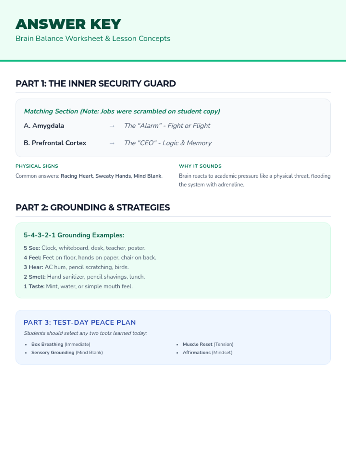 An answer key for the Brain Balance Worksheet and a summary of expected student responses for the grounding techniques.
