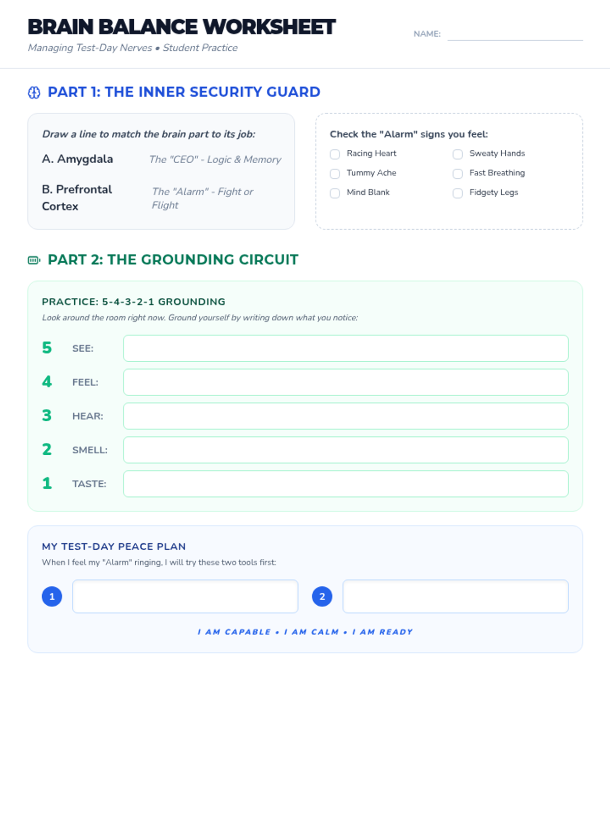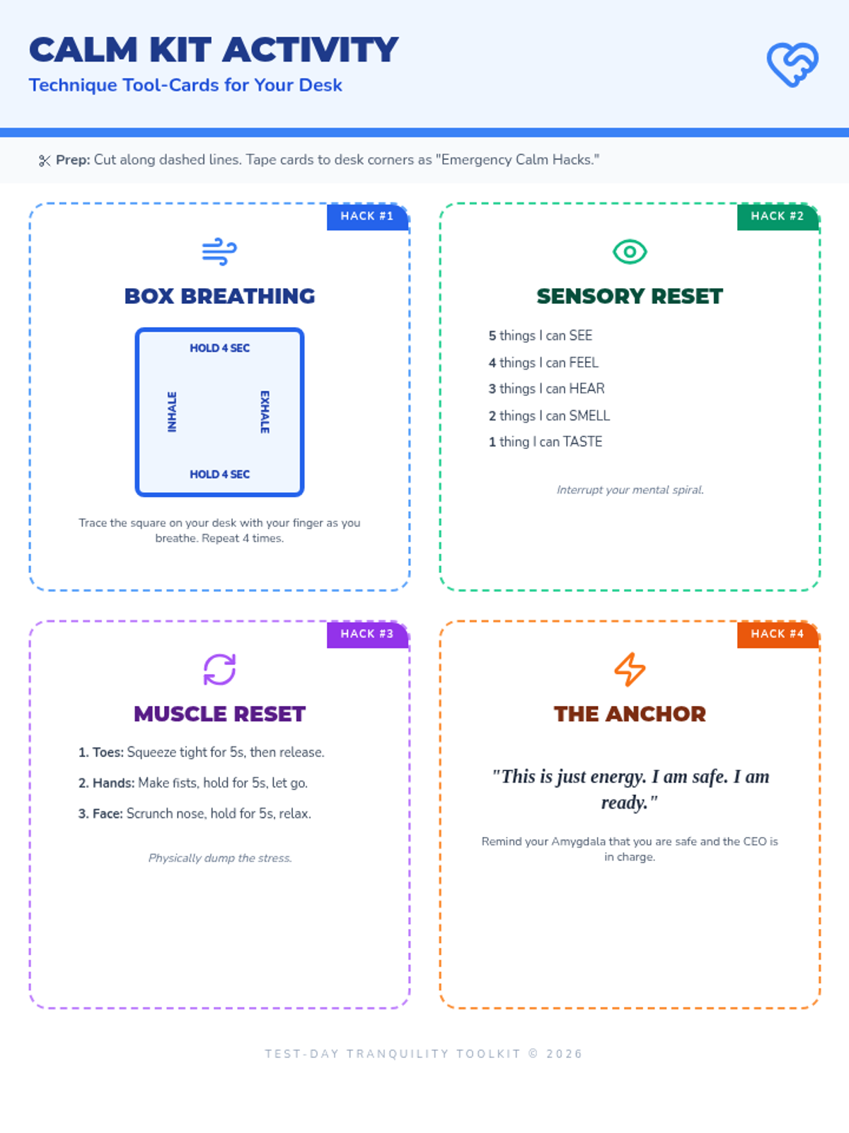 A collection of printable "tool cards" that students can use as physical reminders of grounding techniques during stressful moments like testing.