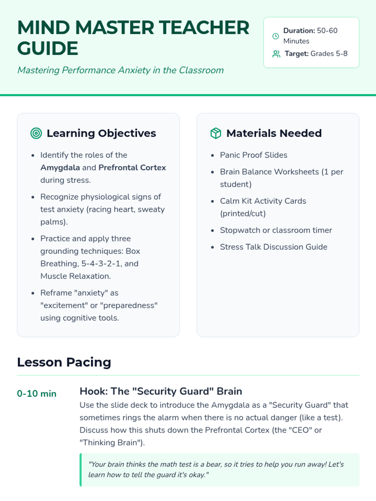 A comprehensive teacher guide for leading a lesson on test anxiety, including learning objectives, a detailed pacing guide, and pedagogical tips.