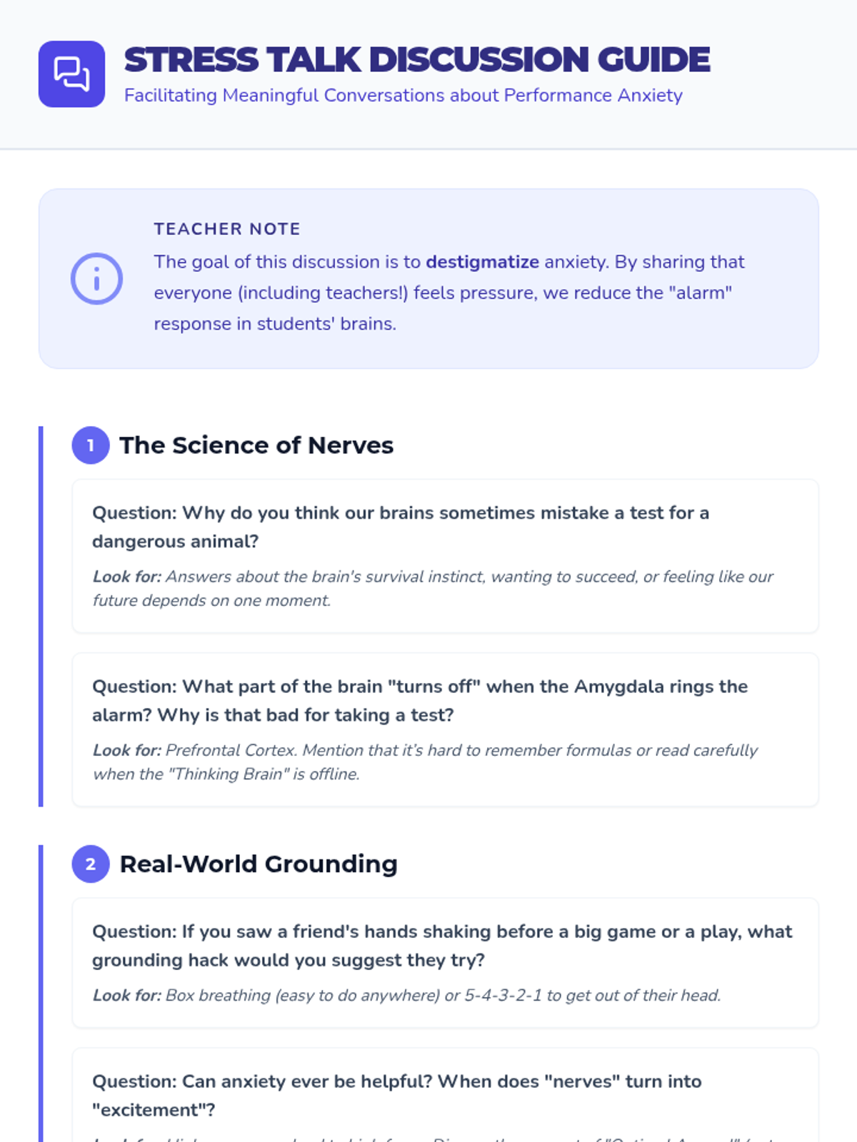 A structured discussion guide for teachers to lead classroom conversations about stress, brain science, and grounding techniques.