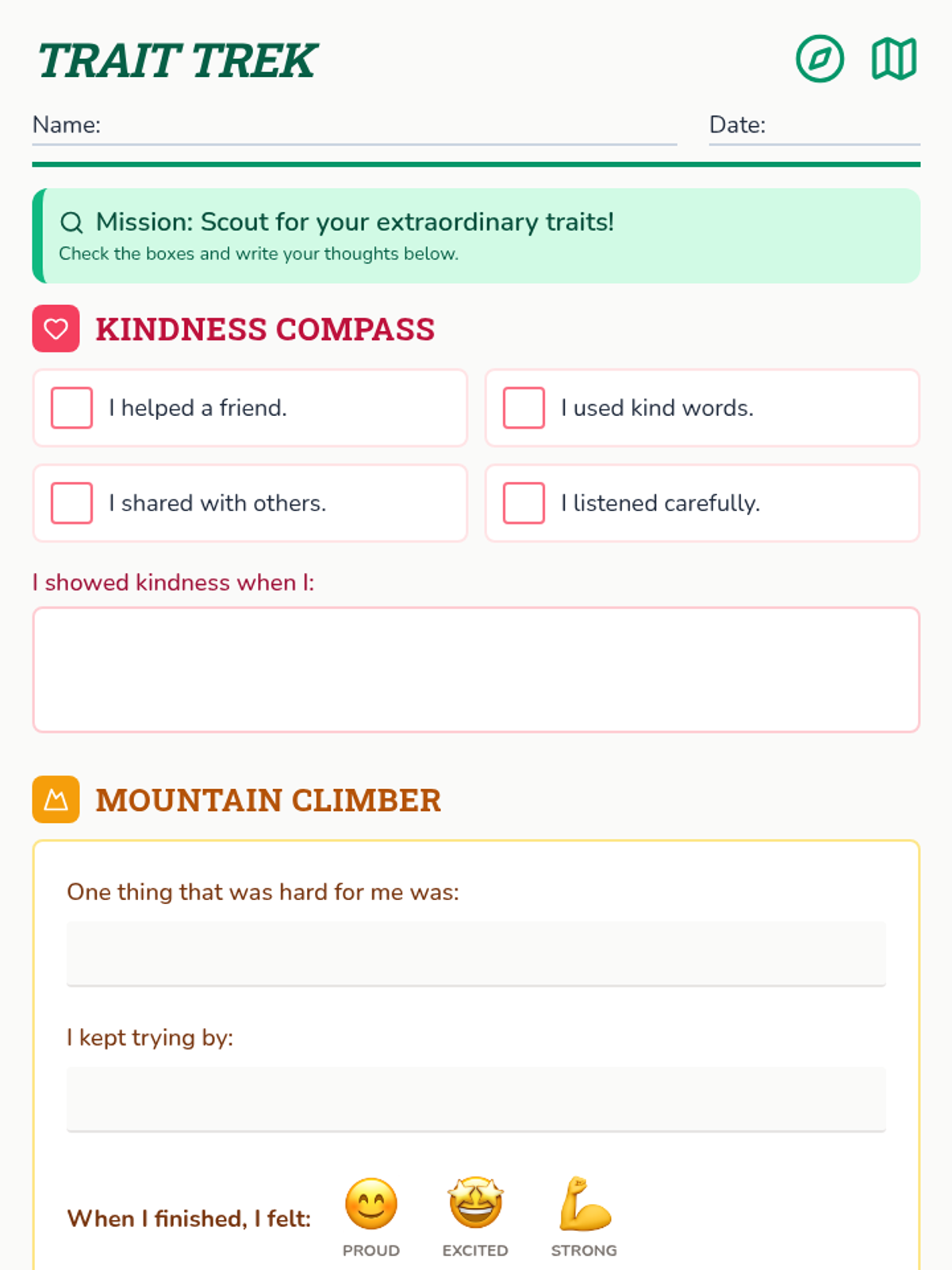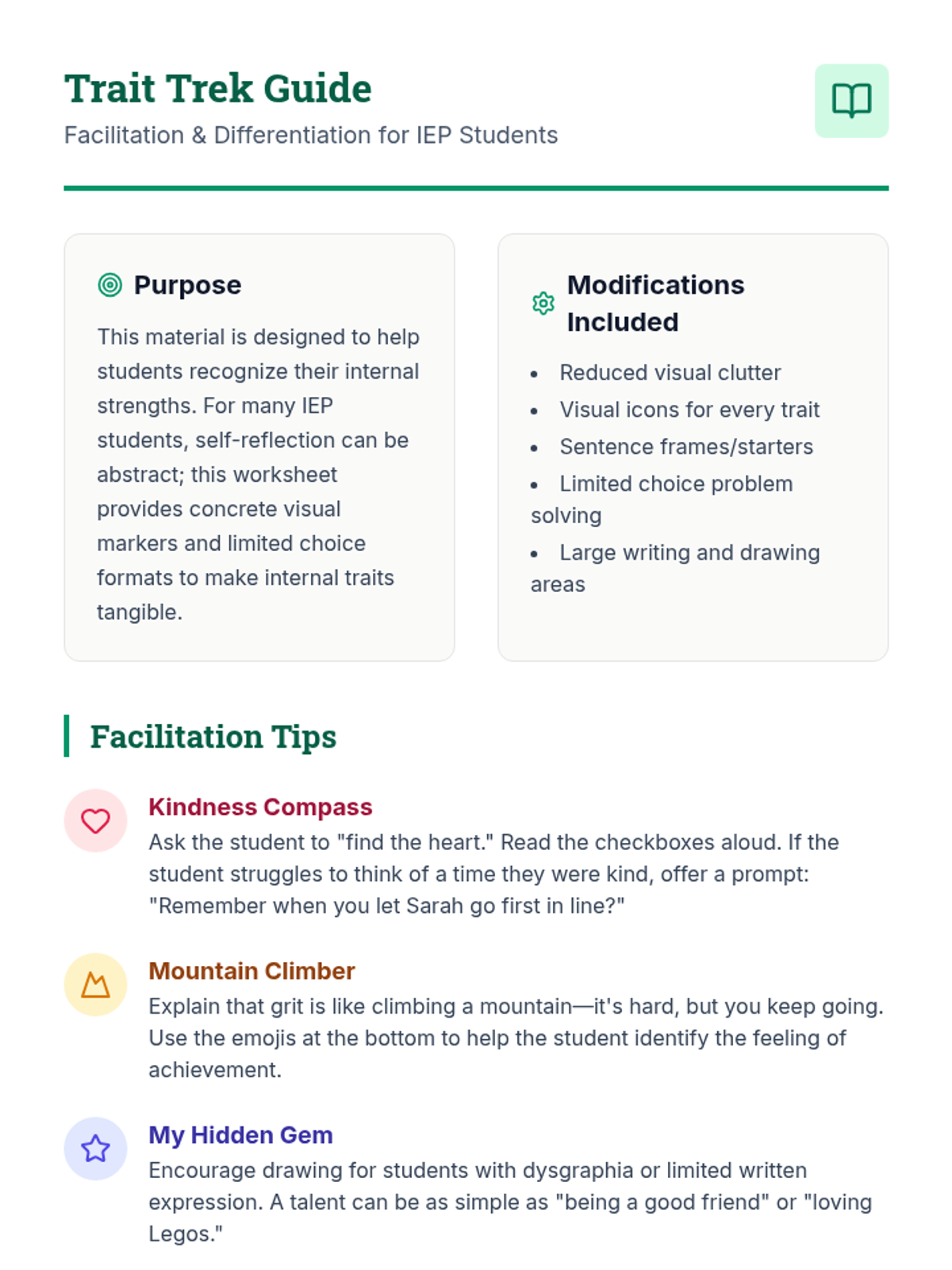 A teacher's guide for the Trait Trek worksheet, providing facilitation tips, specific IEP modifications, and strategies for further differentiation.