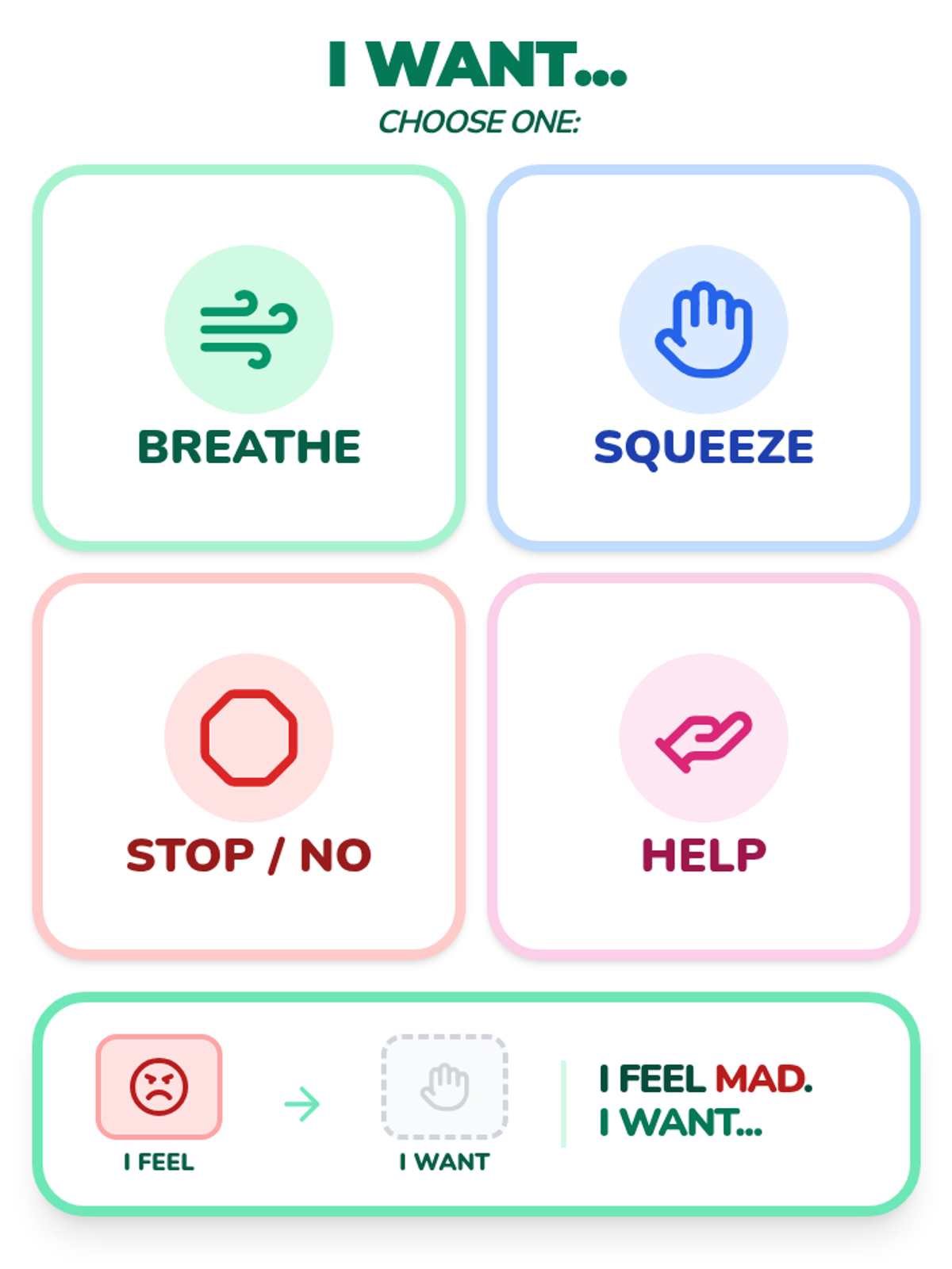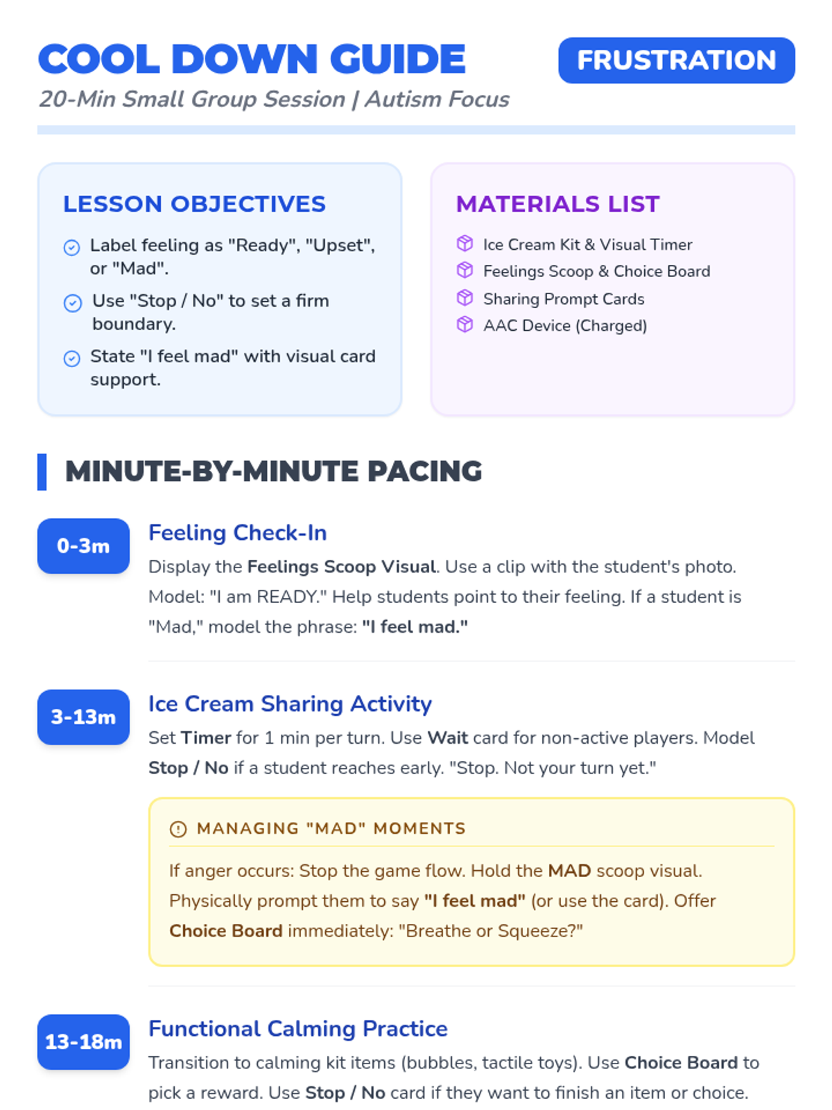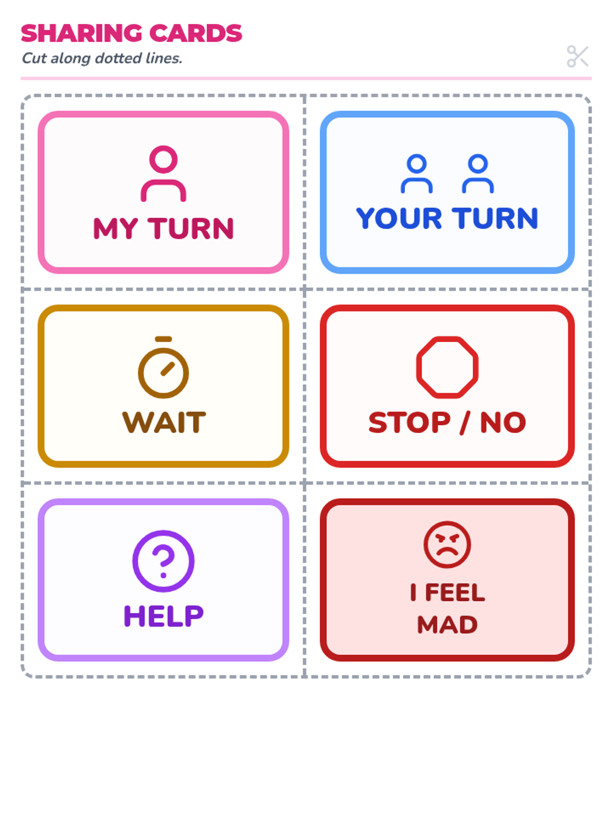 A printable document containing four sentence starter strips and eight communication icons designed for laminating. It supports students in requesting spinning toys and describing their movement (fast, slow, spin, stop).