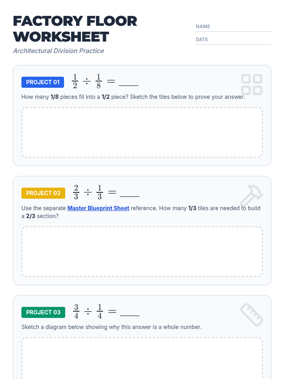 A student practice worksheet styled as a 'Factory Floor' architectural blueprint. It guides students through conceptual fraction division problems (e.g., 1/2 ÷ 1/8) by asking them to use fraction tiles and sketch their visualizations. Includes an exit ticket challenge on general concepts.