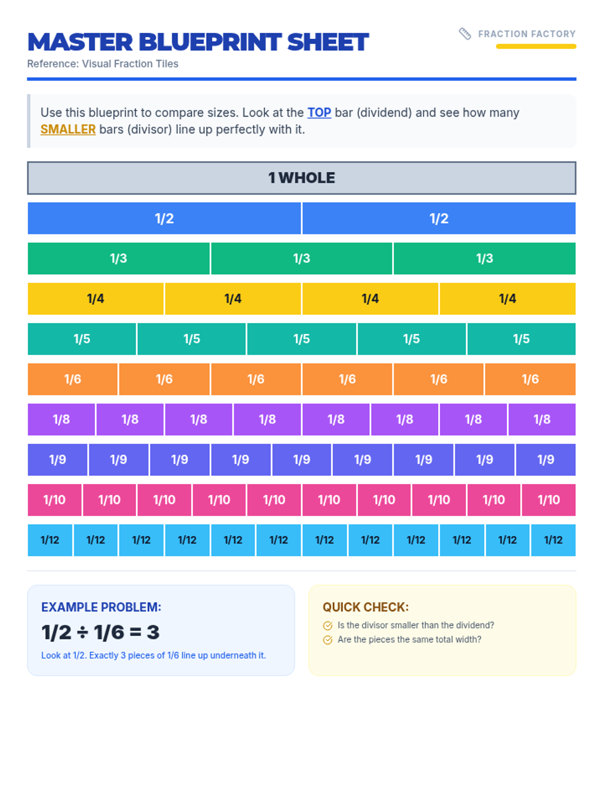 A printable reference sheet containing colorful fraction tiles ranging from 1 whole to 1/12. It serves as a visual guide for students to compare the relative sizes of fractions and conceptualize division as a 'how many fit' relationship.