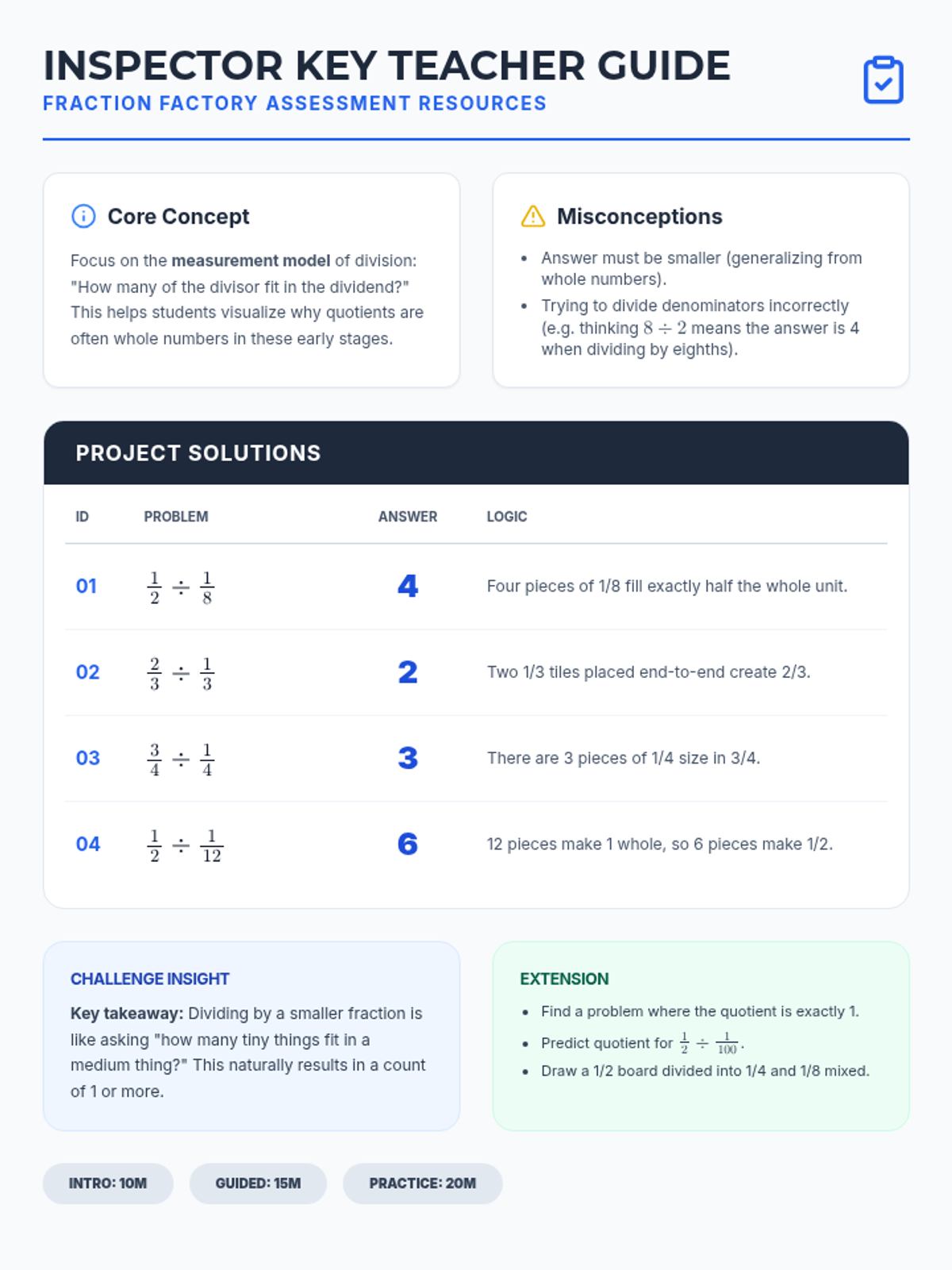 A comprehensive teacher guide and answer key for the 'Fraction Factory' lesson. It includes pedagogical insights on the measurement model of division, common student misconceptions, a detailed answer key for the worksheet, and pacing suggestions.