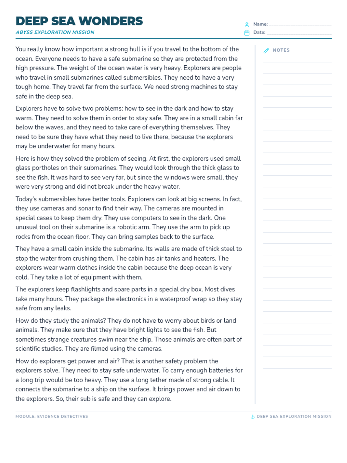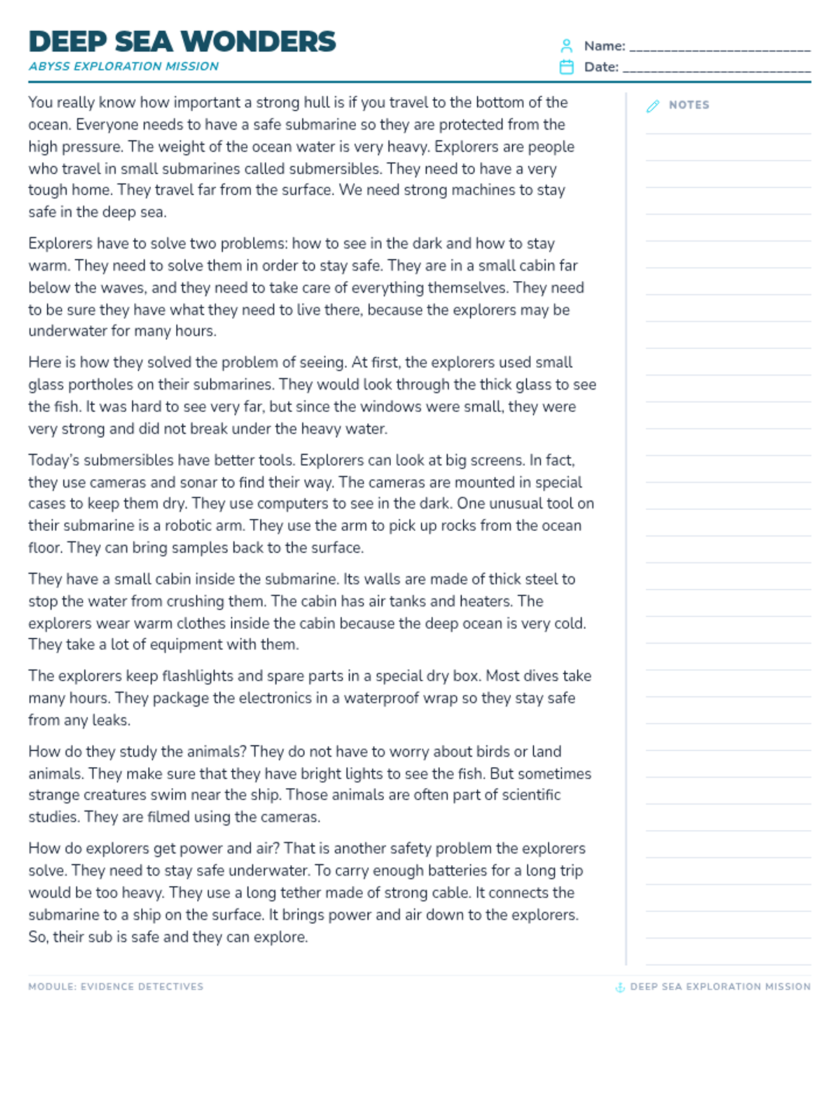 A reading passage about deep sea exploration with a single-page layout. Includes a dedicated annotation space on the right and improved text spacing to ensure the entire passage fits on one page. Font and spacing adjusted to prevent footer overflow. Added more annotation lines.