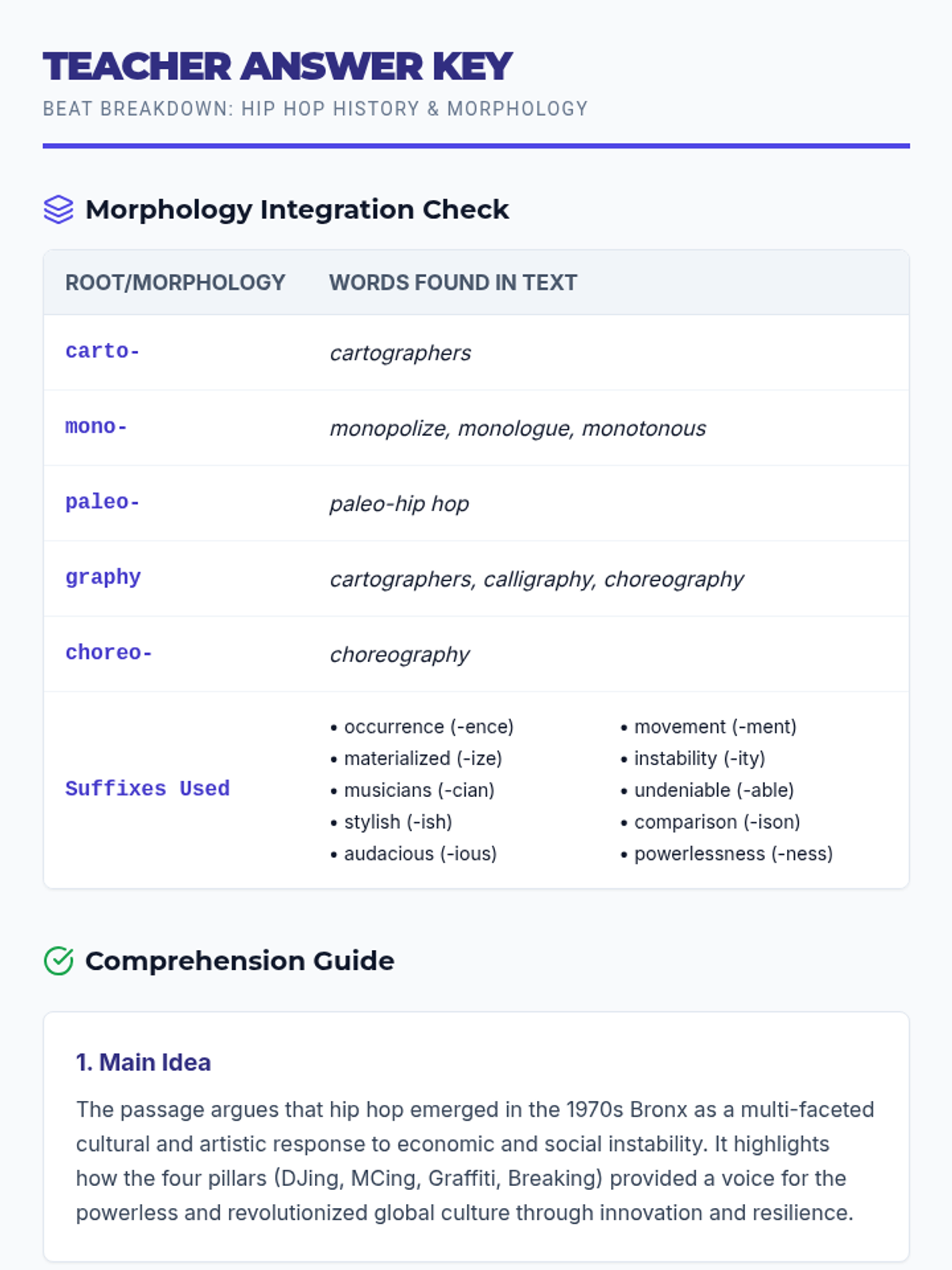 A teacher-facing answer key and morphology guide for the 'Beat Breakdown' reading passage. Includes a breakdown of integrated roots (carto, mono, paleo, etc.) and suggested answers for the comprehension questions.