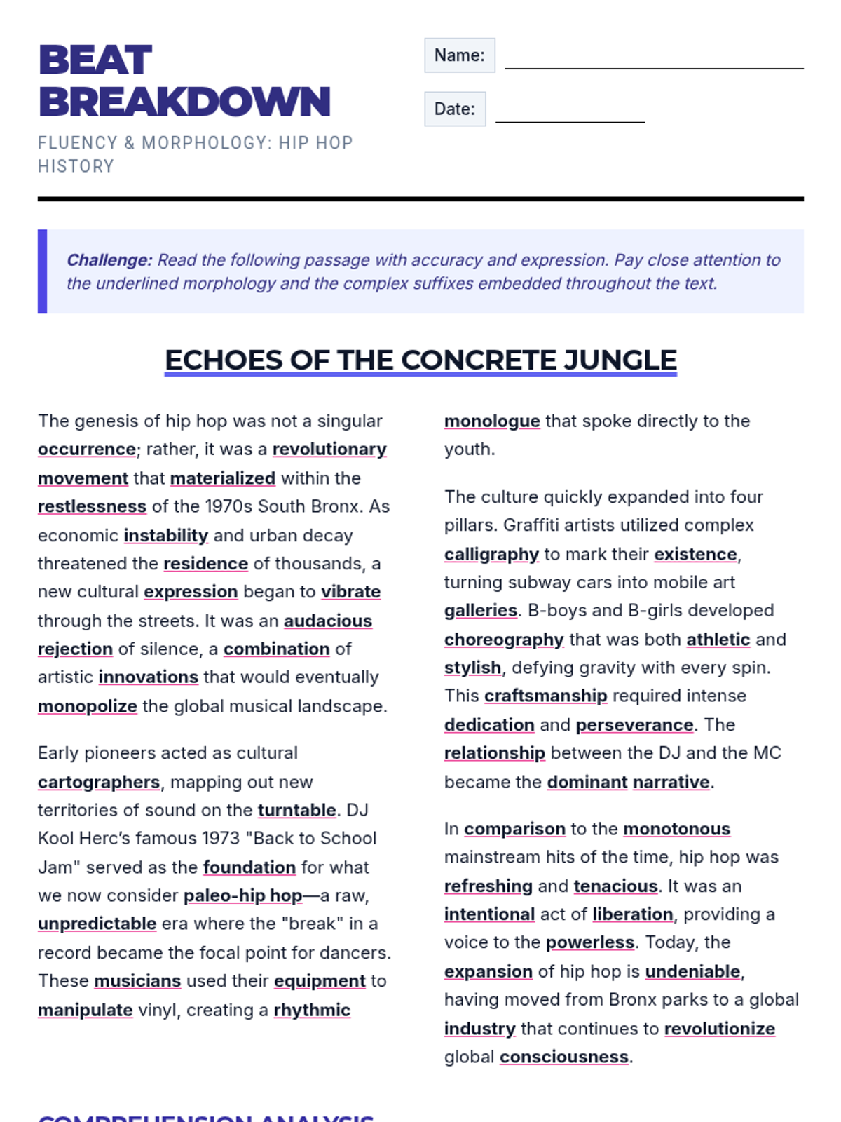 A high-school level fluency passage and comprehension worksheet about the history of Hip Hop, incorporating over 40 specific suffixes and Greek/Latin roots like carto, mono, paleo, graphy, and choreo. Includes a main idea prompt and three higher-order thinking questions.
