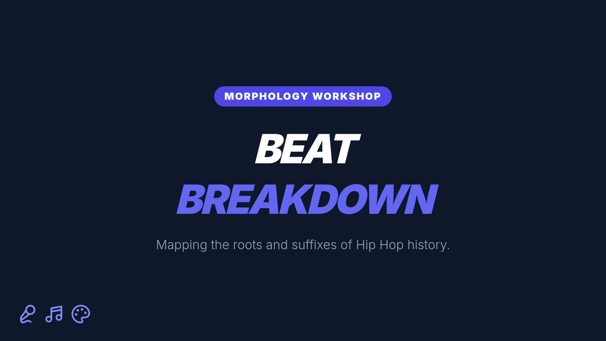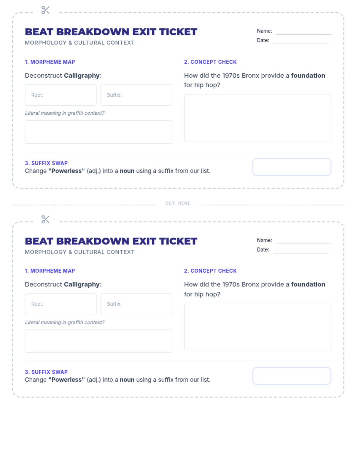 A printable exit ticket for the Beat Breakdown lesson, featuring morphological analysis of 'calligraphy', a context question about Hip Hop's roots, and a suffix application task. Designed with two tickets per page for efficient printing.