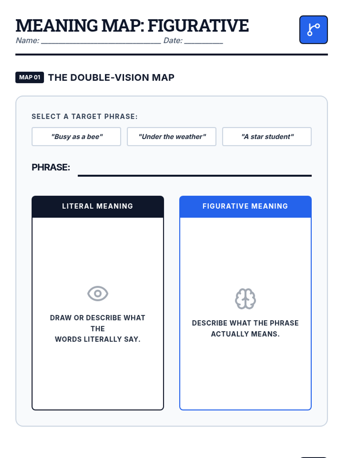 Visual graphic organizers for mapping figurative and literal meanings. Revised to two pages for maximum student work space with specific word banks.