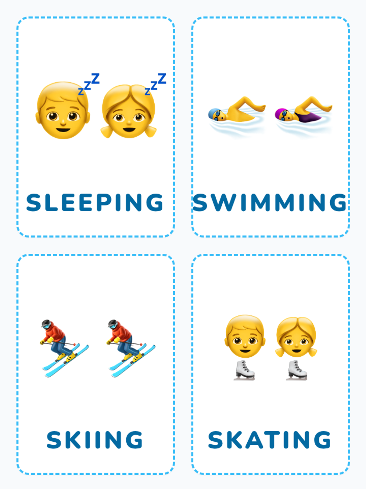 A set of 16 action verb flashcards featuring initial s-blends. Each card depicts multiple people or icons to support plural sentence structures, with a clear label for speech practice. Updated with improved visuals for 'Swinging'.
