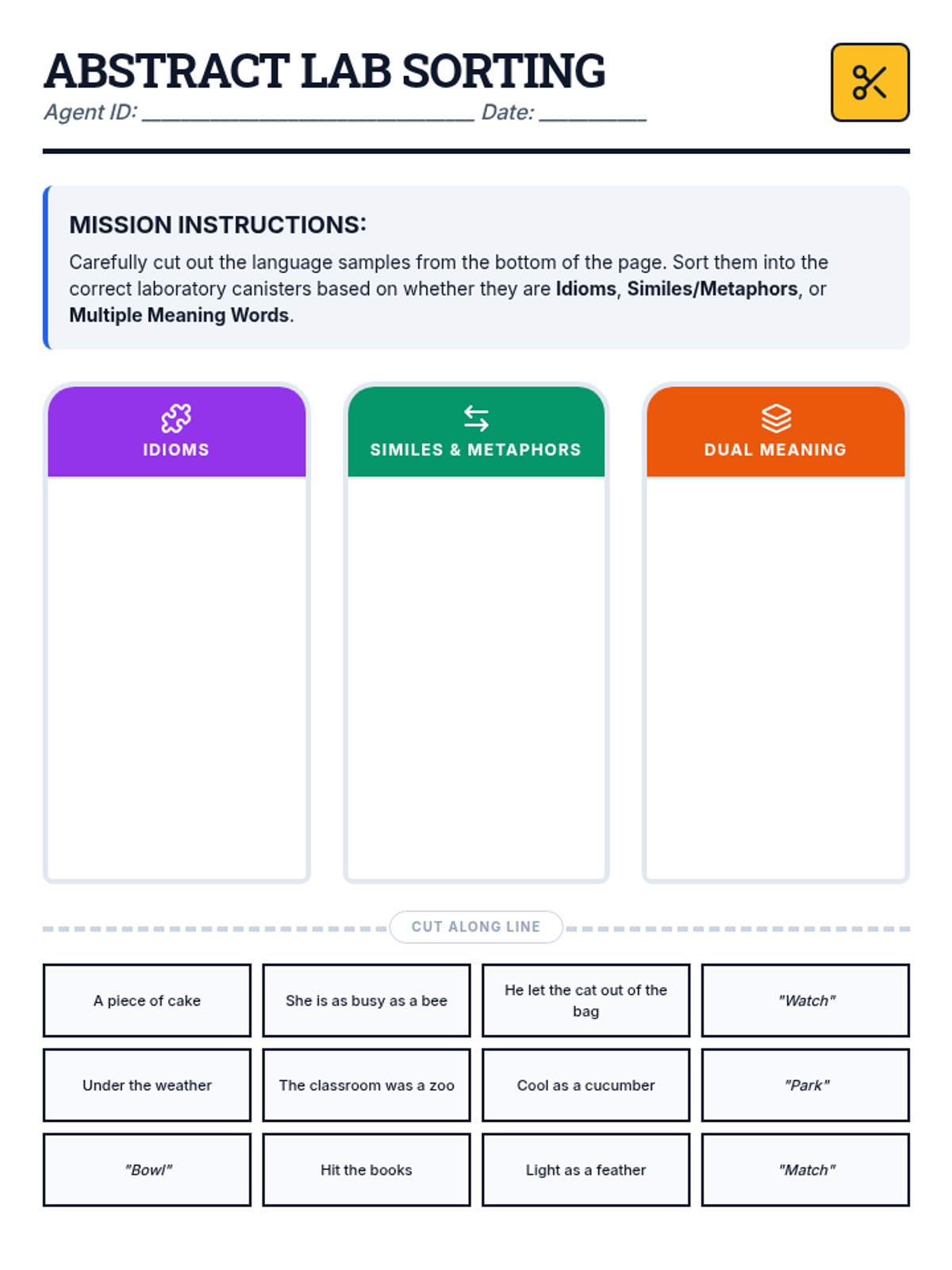 A hands-on cut-and-paste activity where students categorize various examples of figurative language and multiple-meaning words into themed 'canisters'. Revised to fit everything onto a single page.